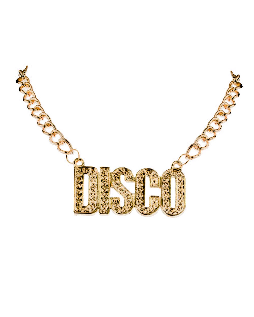 Mit deiner 70er Jahre Verkleidung sorgst du auf der Nightfever Mottoparty für Aufsehen. Immer mit dabei: Deine 70er Jahre Disco Halskette. Die goldene Kette ist ein 70s Kostümschmuck, der dein Outfit perfekt unterstreicht und für die richtige Portion Bling Bling sorgt. Trage die Goldkette mit Disco Schriftzug zu einer Schlaghose mit Hemd oder zu einem 70s Disco Kostüm-Overall und zeige deine Liebe zum funky Lifestyle!