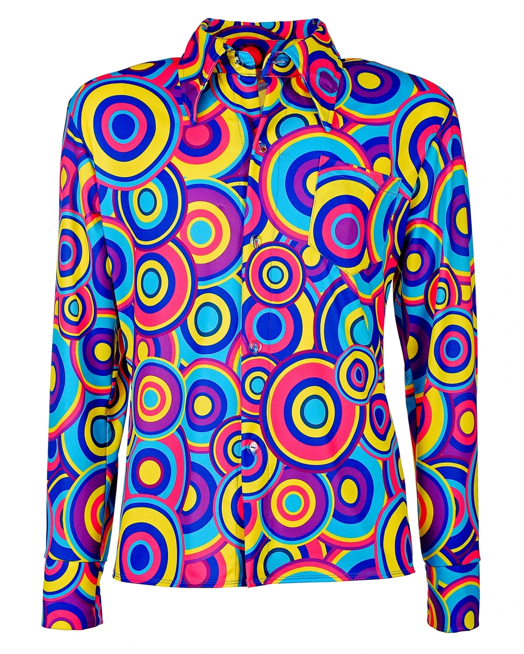 Die wilden 70er sorgen immer noch für Spaß und bunte Verkleidungen an Fasching. Das 70er Jahre Hemd Bubbles Blau macht da keine Ausnahme. Die kunterbunten Kreise machen dich zum psychedelischen Hingucker mit Schwindel-Faktor. Damit bist du beim Schlagermove und der Bad Taste Party der unangefochtene Disco King. Ohne dich läuft nichts auf der Tanzfläche. Egal ob du die Fiesta Mexikana einläutest oder den Zug nach Nirgendwo besteigst. Das Partyvolk groovt mit dir mit.