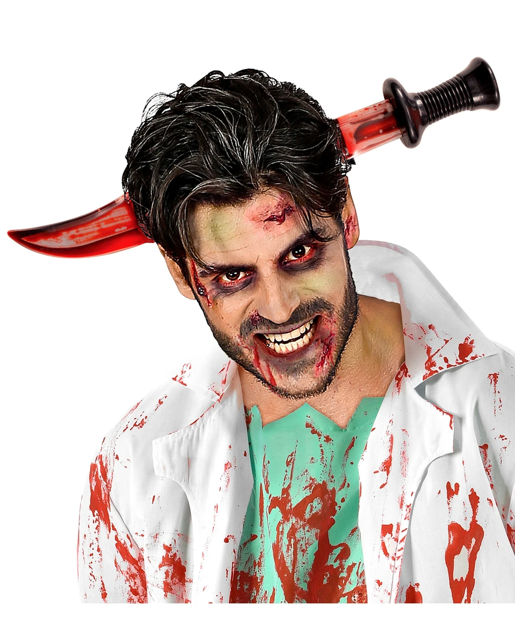 Mit einem Messer im Kopf hilft selbst die beste Kopfschmerztablette nichts mehr. Die Halloween Party ist mit dir als Kopfloses Mordopfer aber bestens bestückt. Das blutige Messer wird einfach wie ein Haarreif auf den Kopf gesetzt und erweckt dadurch den Eindruck als hätte dir jemand den Kopf gespalten.