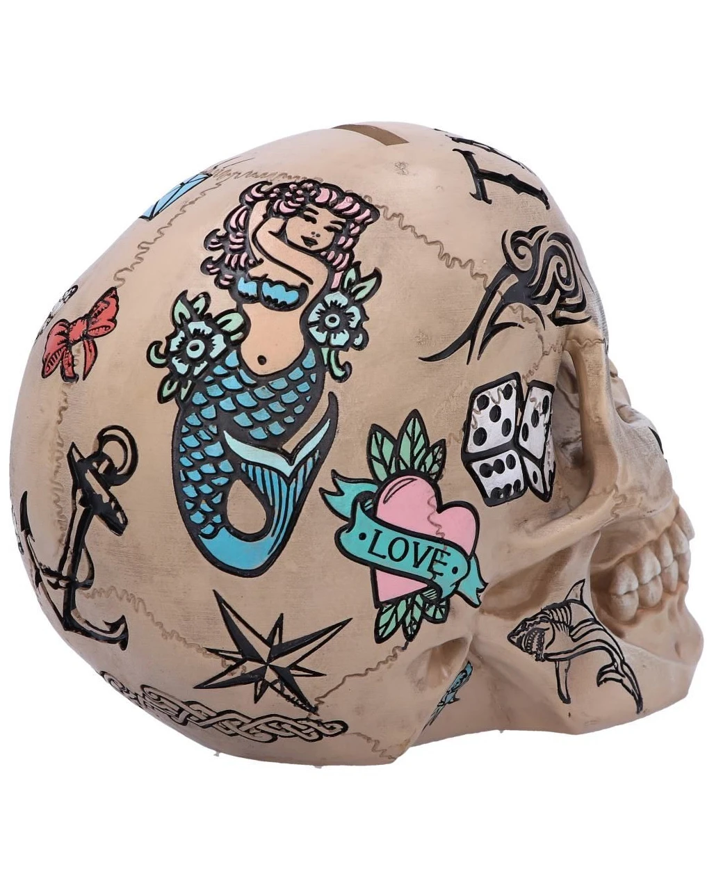 Die Calavera Tattoo Totenschädel Sparkasse zeigt einen beigen Totenschädel der mit einer Vielzahl von Tätowierungs-Stilen verziert ist. Darunter befinden sich traditionelle Tattoos, Stammes- und Illustrations-Tätowierungen. Die Tätowierungen sind in bunter Farbe gemalt, die im Kontrast zum naturfarbenen Totenschädel stehen. Nutze den Calavera Tattoo Totenschädel als Sparkasse bzw. Totenkopf Münzdose oder als dekorativen Blickfang im Regal!