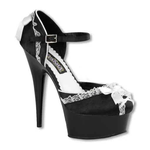 Die Pumps mit Schleife sind im verspielten D´Orsey Style designed und haben als witzigen Clou an der Fußspitze eine hübsche Corsagenschnürung mit weißem Satinband. Zudem haben die Stiletto Heels vereinzelte Borten aus weißen Rüschen angebracht und an der Ferse, sowie oberhalb der Corsagenschnürung eine weiße Schleife. Durch das ausgefallene Design passen die Pin-up High Heels perfekt zu dem Basic Body Schwarz . Am Fußrücken wird der sexy High Heel durch einen Riemchenverschluss geschlossen. In Kombination mit dem Basic Body Schwarz kommen die Pumps mit Schleife ebenfalls perfekt zur Geltung.