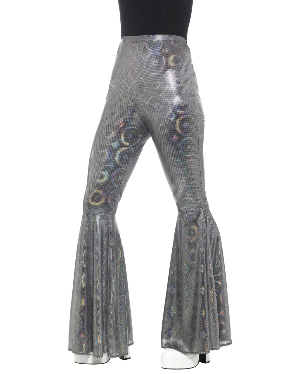 Mit unserer silbern glänzenden Damen Schlaghose hast du ein stylisches Zubehör für deine Hippie Verkleidung und dein Techno-Kostüm. Die Glitzer-Schlaghose eignet sich damit perfekt für Fasching und 60er Jahre, 70er Jahre, Hippie und Disco Motto Partys!