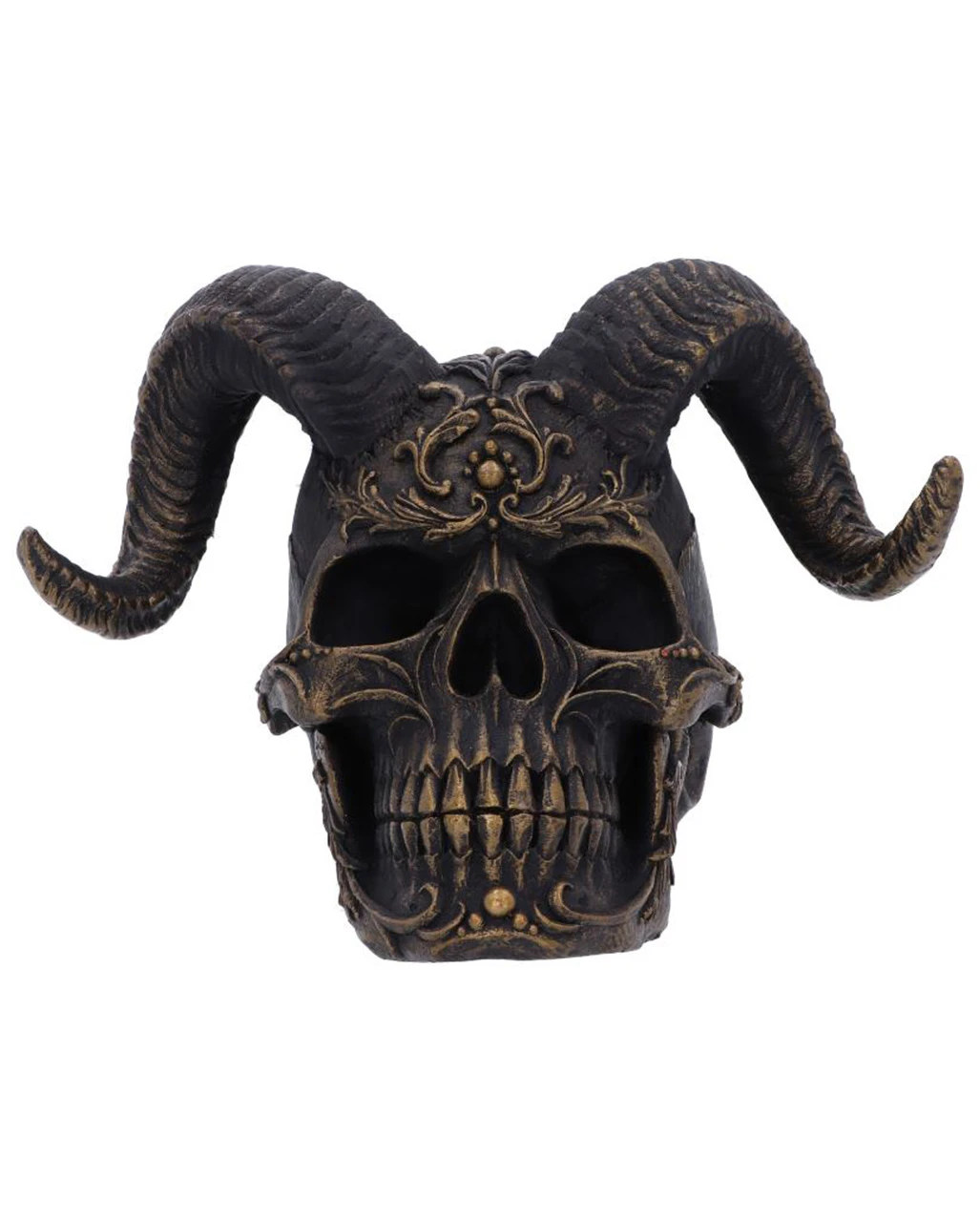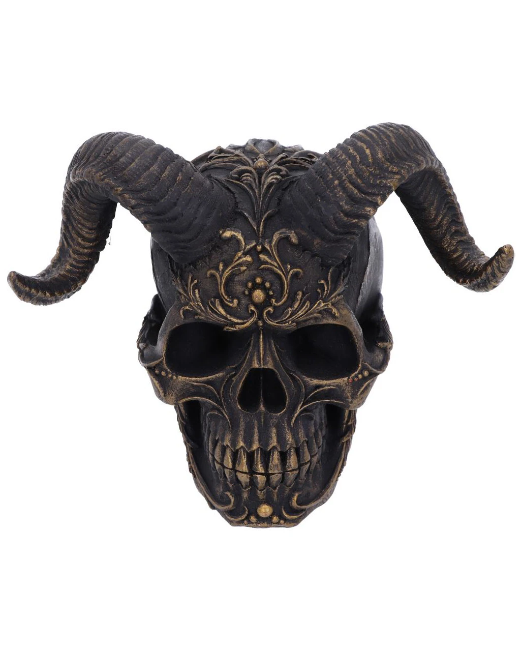 Diabolisch ist genau das richtige Wort, um diesen antiken Totenschädel mit Hörnern zu beschreiben. Der mystische Diabolus Totenkopf präsentiert sich mit mächtigen geschwungenen Hörnern sowie einem kunstvollen, floralen Muster. Der mit Widderhörnern verzierte Totenkopf ist eine fantastisch aussehendes Gothic Wohnaccessoire, das deine Vorliebe fürs okkulte widerspiegelt. Auch als Geschenkidee macht sich unser gehörnter Totenkopf ideal.