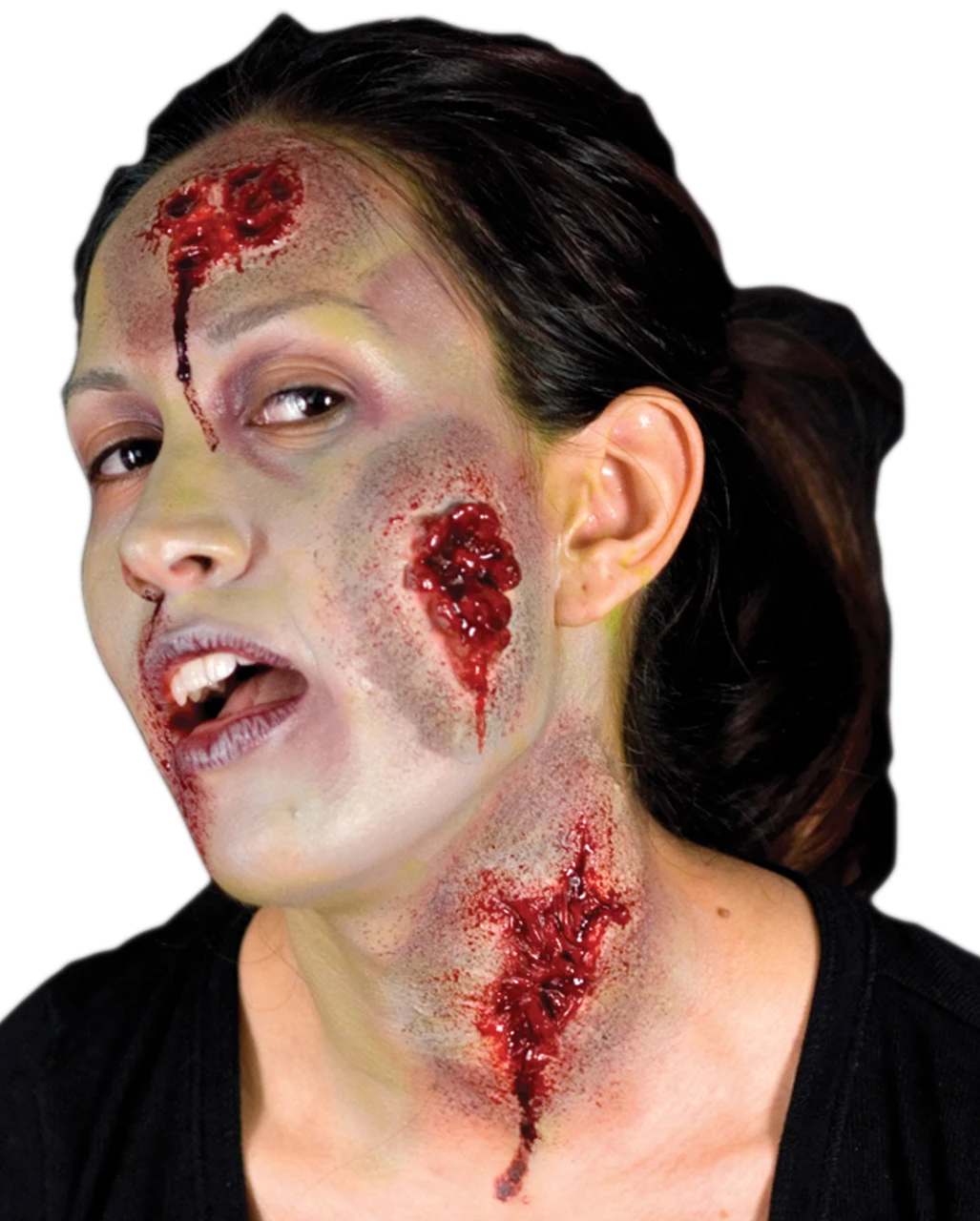 Ein derbes Halloween Make Up als SFX Make-up ist für einen Horrorfilm genauso wichtig, wie für eine Halloween Party. Das Auffallen mit der Eiter Wunde Latexapplikationen ist dir garantiert. Mit viel Filmblut und Make Up perfektioniert, sorgt die 3-teilige Latexwunde bestimmt für einen Schockeffekt. Vielseitig einsetzbar, lassen sich die Wunden mit Hautkleber auf Gesicht, Arme oder Beine montieren.