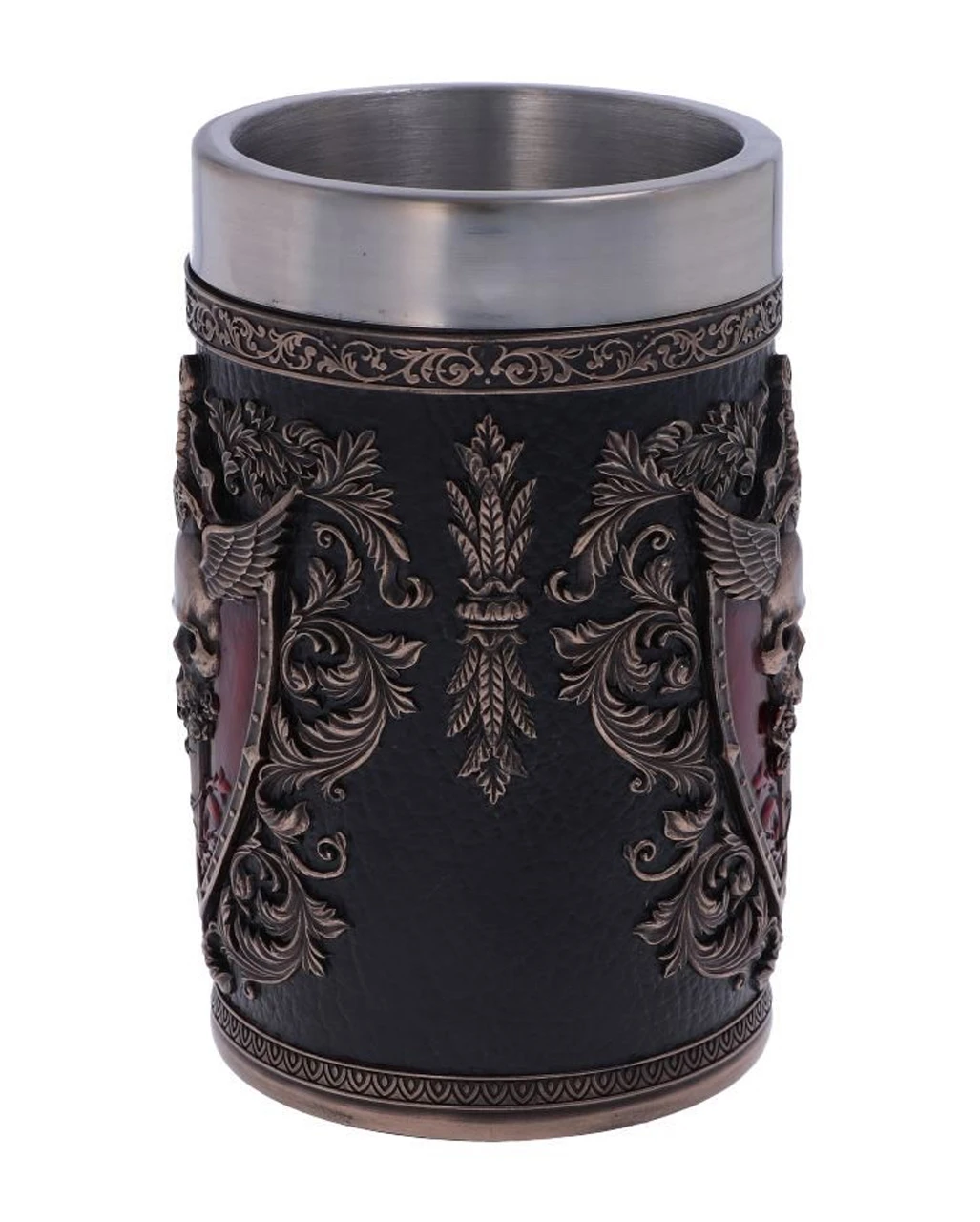 Et Alas Mortis steht im Lateinischen für „Flügel des Todes“, was auf unserem Krug in Form des Sensenmannes als Engel des Todes dargestellt wird. Der mittelalterlich-düster gestaltete Humpen eignet sich hervorragend als authentische Tischdeko für Fantasy- und Gothic-Fans!