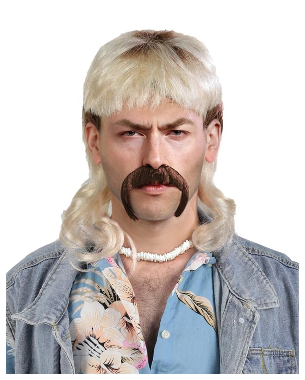 Der exotic Tiger Vokuhila ist im namensgebenden „Vorne Kurz, Hinten Lang“-Stil gehalten und blond-braun meliert. Die innen verwendete Netzstruktur sorgt für optimalen Halt und eine gute Passform der Faschings-Frisur. Dazu empfehlen wir das Schnauzbart Set 7 St. und das Perückenstrumpf Set 2-tlg..