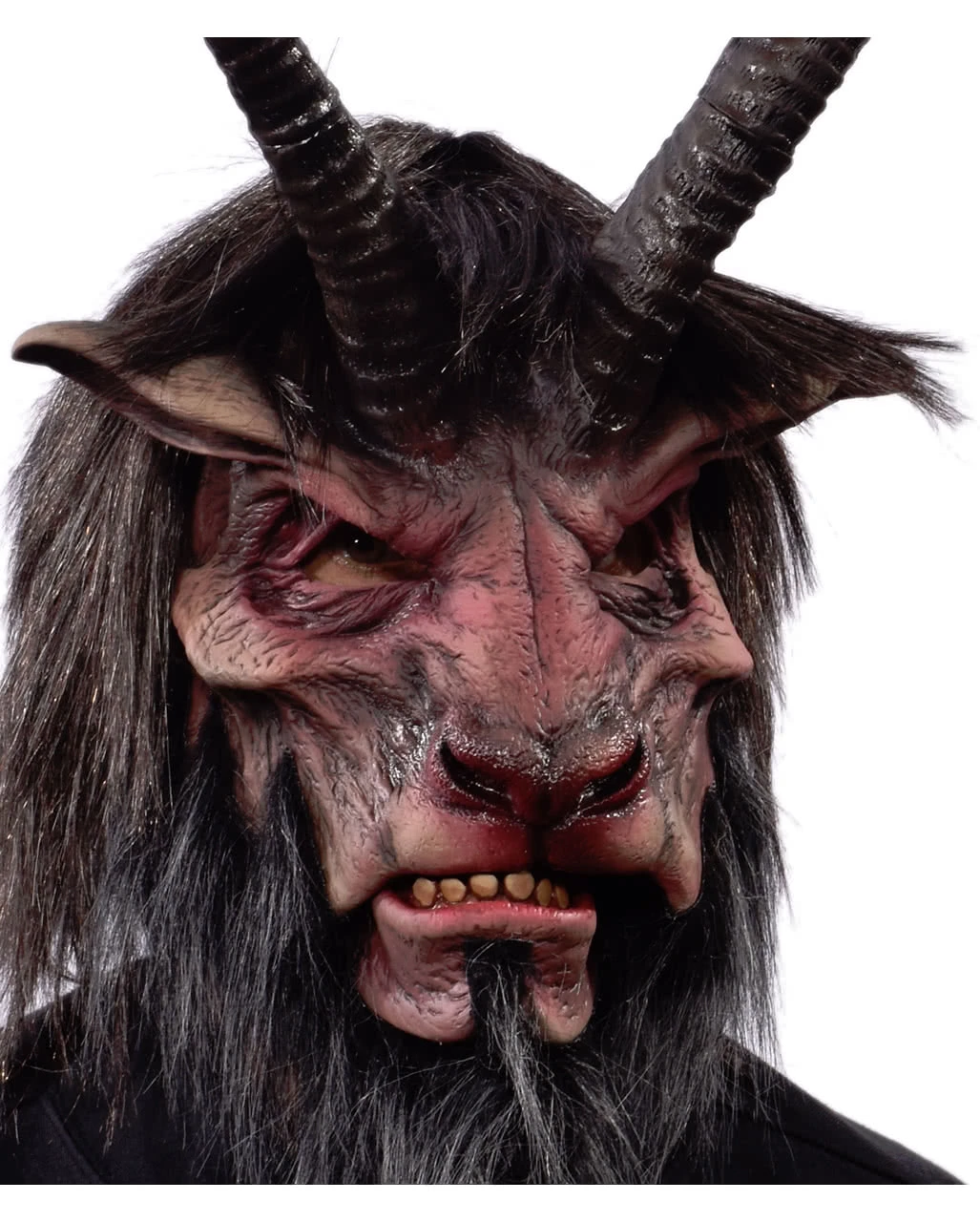 Die Krampus Maske ist mit ihrer braun melierten hochwertigen Perücke und den grau melierten Kunsthaaren an Backen & Kinn – sowie den ca. 40 cm langen imposanten Hörnern, die am Ansatz mit Kunststoff verstärkt sind – eine originalgetreue Abbildung des mystischen Fabelwesens. Tiefe Gesichtsfalten und die rosa-graubraune Hautfarbe runden den schaurigen Anblick ab. Neben dem angenehmen Tragekomfort und guter Sicht dank Aussparungen an den Augen kommt das Maul als Extrateil daher, wird über das Kinn gezogen und bewegt sich somit gruselig mit. Zwei Gummibänder über Kreuz sorgen zudem für guten Halt am Hinterkopf. Mit der Nikolaus Rute und Pranken aus Latex haben wir auch das passende Zubehör bei Horror-Shop.com im Sortiment.