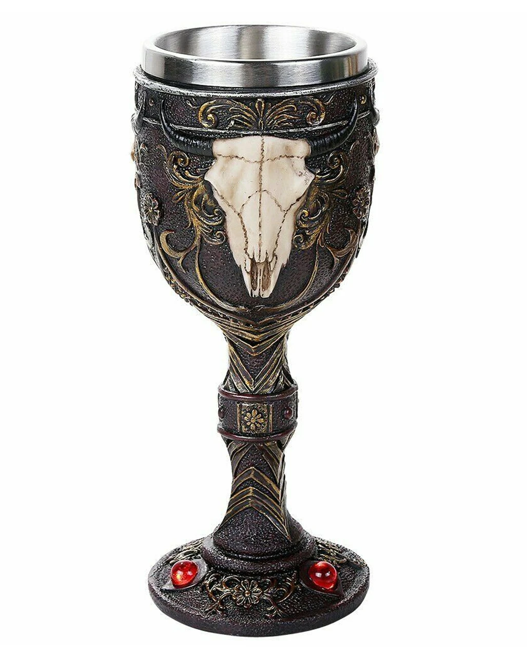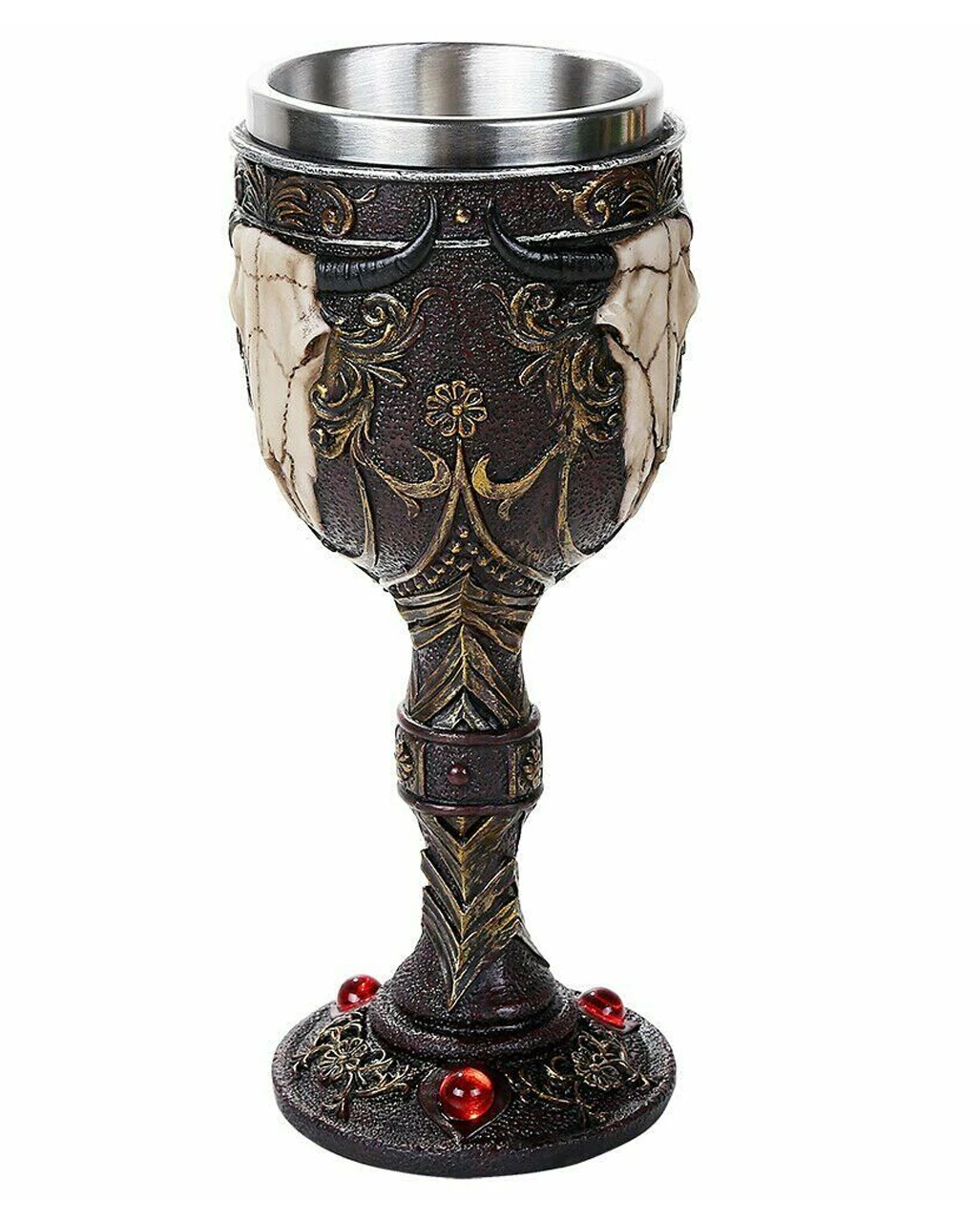 Auch als Halloween Deko Kelch und als Geschenkartikel bestens geeignet: unser gehörnter Stierschädel Kelch ist aus hochwertigem Polyresin gegossen. Der Stiel des Weinkelches ist mit feinen Blüten verziert. Weitere prunkvolle Details bilden die Ranken und die roten Edelsteine. Absoluter Hingucker aber ist der blanke Stierschädel. Der Kelch besitzt für eine einfache Reinigung einen herausnehmbaren Edelstahleinsatz.