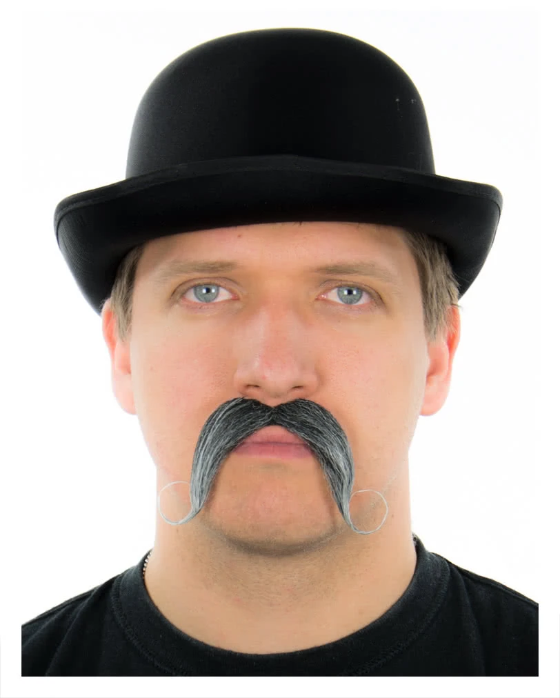 Der Gekräuselte Handelbar Schnauzbart in schwarz-weiß macht dich zum starken Gallier oder einem Gentleman des 19. Jahrhunderts. Die Bartform folgt den aktuellen Barttrends und dich für Frauen besonders hübsch anzusehen.