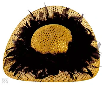Mit diesem Glitzer Party Hut machst Du den feinen Lady von der Rennbahn in Escot und selbst Queen Mom ordentlich Konkurenz. Der goldfarbene, glitzernde Partyhut ist über und über mit goldenen Pailetten besetzt und hat einen flotten Schwung. Der aussergewöhnliche Hut einer mondänen Dame ist zusätzlich in der Mitte mit üppig schwarzen Federn verziert. Dieser extravagante, glitzernde Partyhut ist vielseitig einsetzbar und gibt Deinem Karnevals-Kostüm die notwendige Klasse.