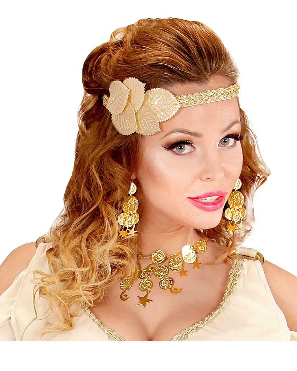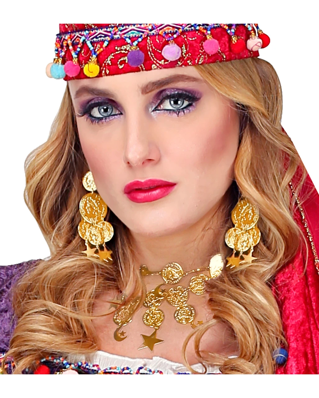 Das goldglänzende Schmuckset besteht aus der Kette, die aus vielen goldfarbenen geprägten Münzen, sowie Sternen und Monden besteht. Zusätzlich liegen zwei Ohrclips bei, die das schöne Kostümaccessoire komplettieren. Viele Halloween- und Karnevalskostüme lassen sich mit dem passenden Kostümschmuck erst richtig zu Geltung bringen.