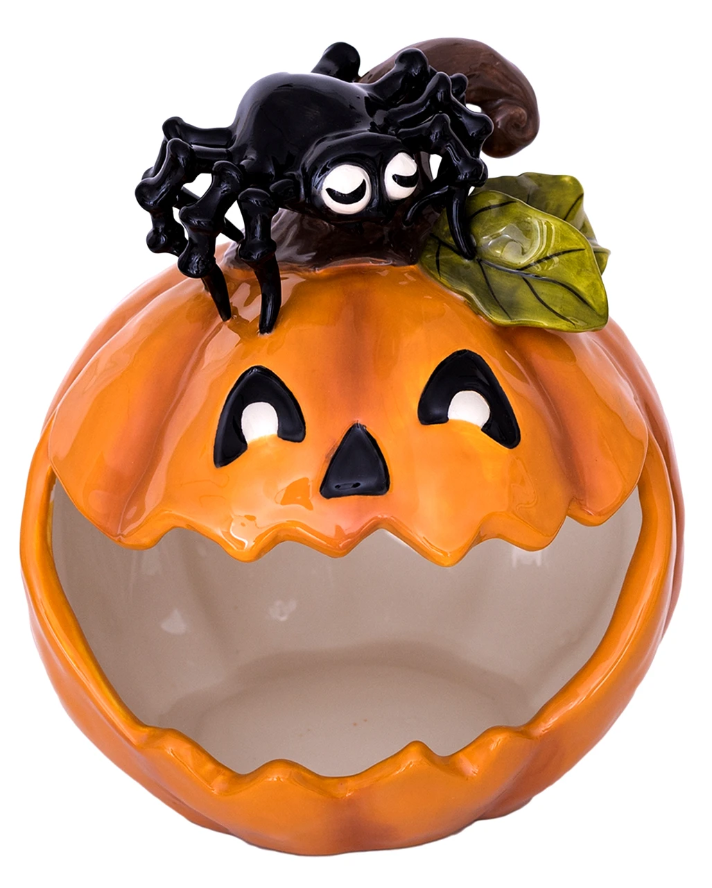 Unsere Halloween Kürbis Keramik Süßigkeiten Schale ist das Highlight auf jedem Halloween Buffet. Das breite Grinsen des Keramik Kürbis ist steckt direkt an und versetzt dich sofort in schaurig schöne Halloween Stimmung. Der absolute Clou der fröhlichen Halloween Süßigkeiten Schale ist eine niedliche schwarze Spinne, die frech am Strunk des Kürbisses sitzt und dich mit zuckersüßen Augen anblickt. Aber, lass dich nicht täuschen, die kleine Spinne behütet den Inhalt vor kleinen Süßigkeiten Monstern.