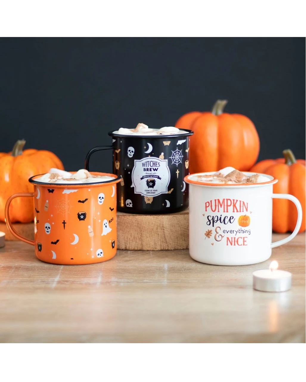 Die Tasse im Emaille-Stil zeigt klassische Halloween Motive und ein Schild mit dem Aufdruck „Witches Brew“ als Print. Die Darstellungen von Hexenkesseln oder Totenköpfen akzentuieren das magische Flair des Keramikbechers. Damit ist die Hexentrank Emaille Tasse auch eine wunderbare Geschenkidee für den Gastgeber der Halloween Party. Oder du servierst den Punsch in der Gruselnacht in dieser tollen Kürbis Motiv Tasse. Allerdings solltest du gut aufpassen. Der Emaille Becher ist nicht für die Mikrowelle oder zum Wärmen über offenem Feuer geeignet.