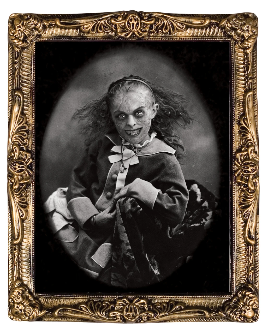 Gibt es einen größeren Schock, als ein süßes Mädchen, dass sich in eine fiese Zombie-Gestalt verwandelt? Das gruselige Wackelbild macht sich ganz hervorragend auf deiner Halloween Party. Das gerahmte Schwarz-Weiß-Bild im Antik-Look zeigt ein niedliches Mädchen. Betrachtest du es aus einem anderen Blickwinkel, erscheint ein dämonisches Zombie-Mädchen. Bei diesem Anblick stellen sich dir und deinen Halloween-Gästen die Nackenhaare auf!