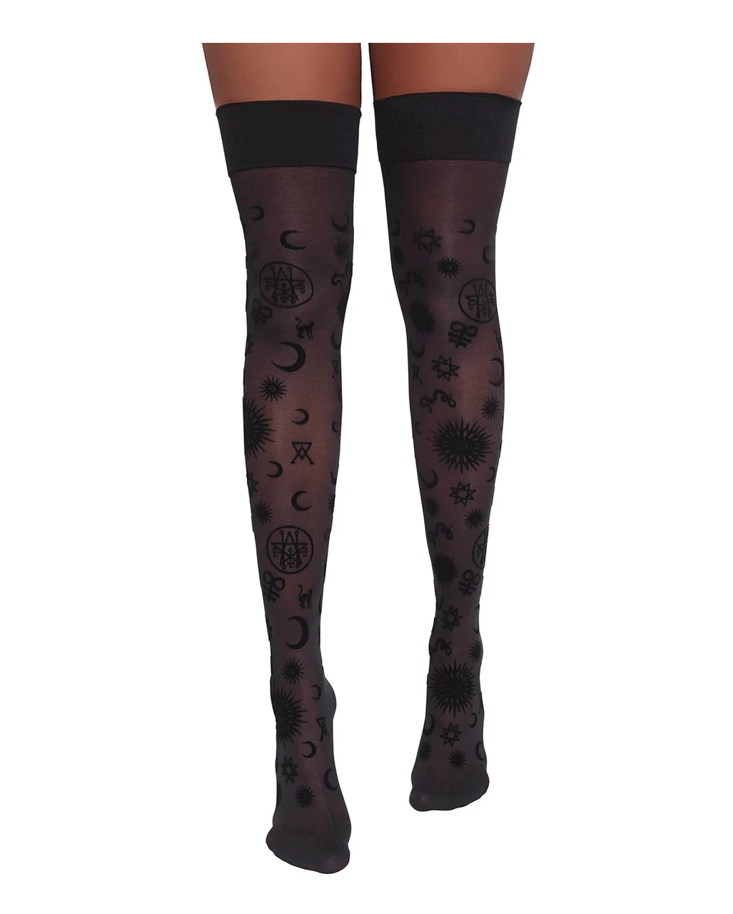 Extravagante, halterlose Strümpfe mit okkultem Ritualmotiv
