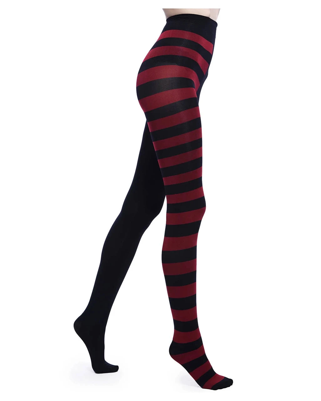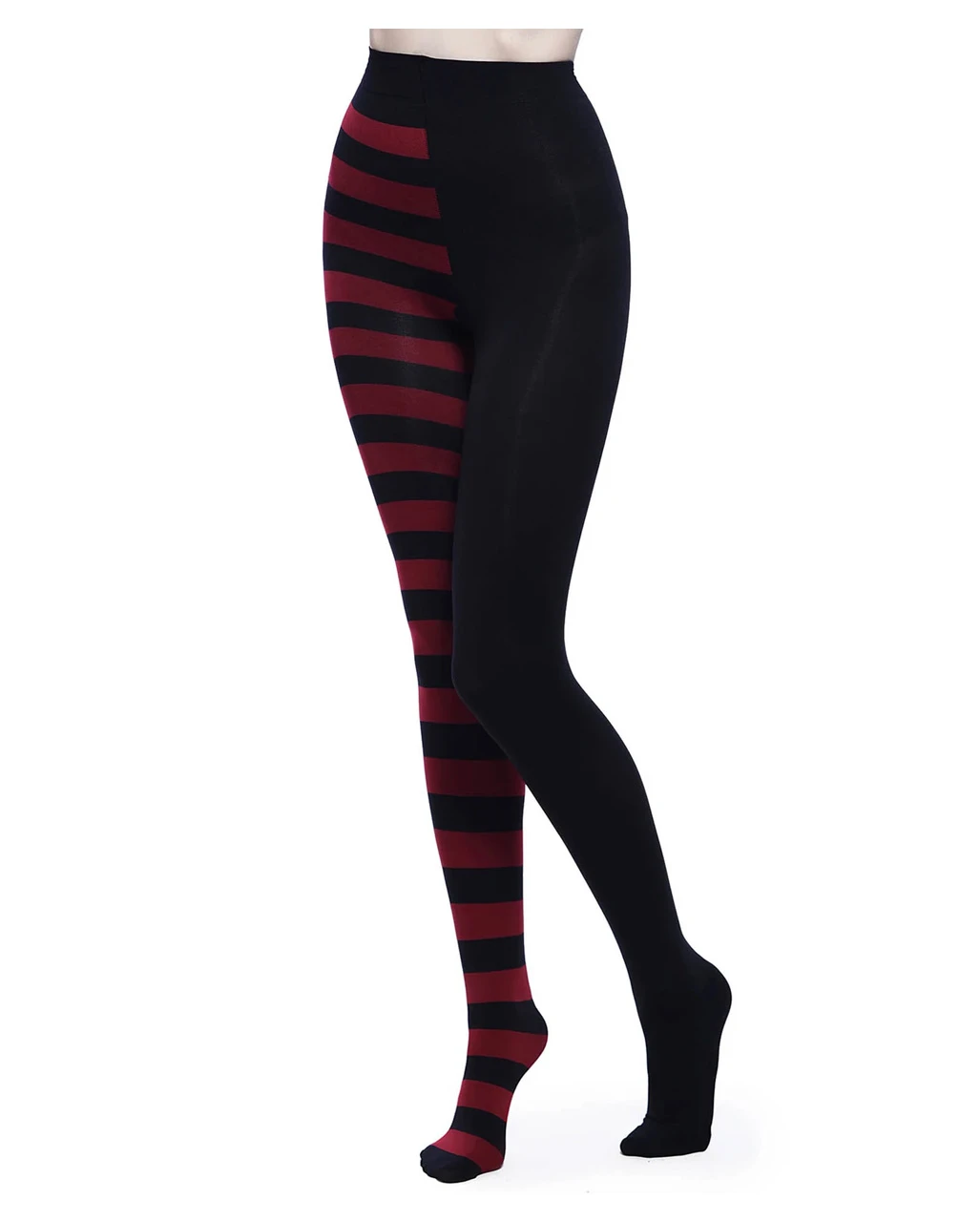 Pimpe damit deinen Bestand an Gothic Mode Accessoires. Die KILLSTAR Ella Strumpfhose mit Streifen ist perfekt, um damit deiner Kleidung einen frechen Hauch von Farbe und Drama hinzuzufügen! Die blickdichte Nylon Strumpfhose ist einem Bein komplett schwarz, das andere Bein der Strumpfhose ist zusätzlich mit roten Streifen versehen. Die Gothic Strumpfhose passt zu allem, sieht aber vor allem zu Skater-Kleidern und Röcken hinreißend aus!