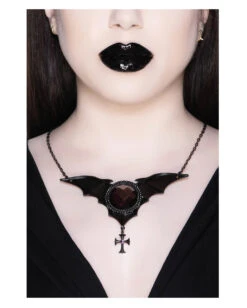 Die Fledermaus Kette mit lila Schmuckstein ist außergewöhnlich designt. Sie besteht aus Acryl, die Hänger sind aus Metall gefertigt. Neben den Flügeln und dem Dekostein ist diese hübsche Gothic Kette auch mit einem kleinen Kreuz-Anhänger versehen. Kombiniere die KILLSTAR Halskette mit den passenden Ohrringen. Diese findest du mit KILLSTAR Evil Intentions Ohrringe!