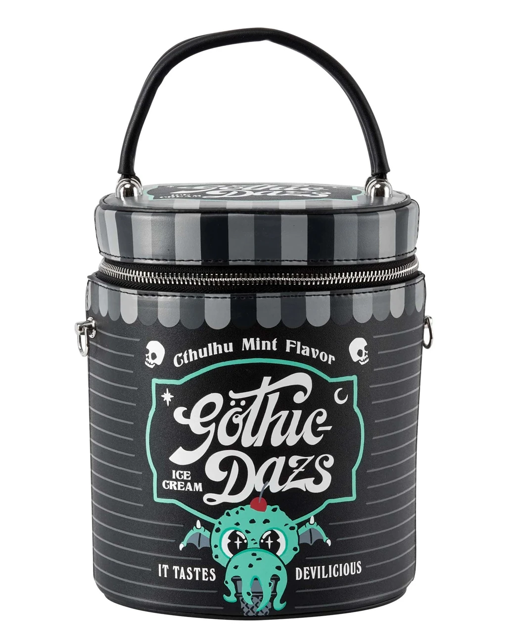 Neben deinen vielen anderen Gothic Mode Accessoire, die deinen alternativen Modestil definieren, hat die KILLSTAR Goth Dazs Handtasche einen ganz besonderen Stellenwert. Die niedliche und verspielte Gothic Handtasche besitzt die Form eines Eiscreme Behälters. Gothic Dazs‘ hat also eine runde Form und ein aufgedrucktes Cthulhu Motiv auf der Vorderseite. Die Tasche hat einen Reißverschluss und bietet genug Platz für alle wichtigen Utensilien – Damit ist sie perfekt zum Ausgehen, für Foto Shootings oder einfach nur zum Abhängen mit deinem Hexenzirkel!