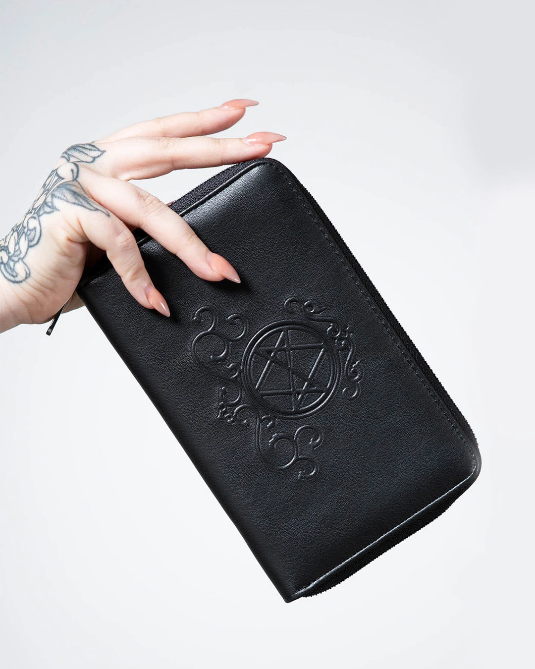 Die coole KILLSTAR Spellcaster Geldbörse begleitet dich Tag und Nacht bei deinen kostspieligen Abenteuern. Münzen, Scheine und Kreditkarten finden hier ein sicheres Plätzchen. Das Gothic Accessoire kommt in einem ansprechenden, schlichten Design mit okkulter Pentagramm-Prägung auf der Vorderseite. Es ist komplett in Schwarz gehalten und integriert sich perfekt in deine dunklen Gothic Roben.