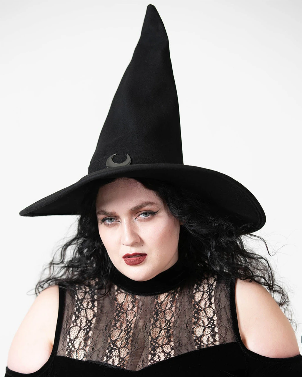Kostümiere dich als magische Hexe und sorge mit deinem Look für Aufsehen. Ein schwarzes Kostümkleid passt super zu deinem neuen Hexenhut mit Halbmond Detail. Der KILLSTAR Super Moon Hexen Hut ist extra groß, mit einer mystischen Mondschnalle designt und super kombinierbar. Ob zum Mini Gothic-Kleid oder zum langen Hexenkostüm: Dieser schöne Hut sollte in keinem Kostümschrank fehlen. Ergänze dein Kostüm zusätzlich mit schönem KILLSTAR Schmuck und einem dunklen Make-up – fertig ist der Look, den Hexen lieben.