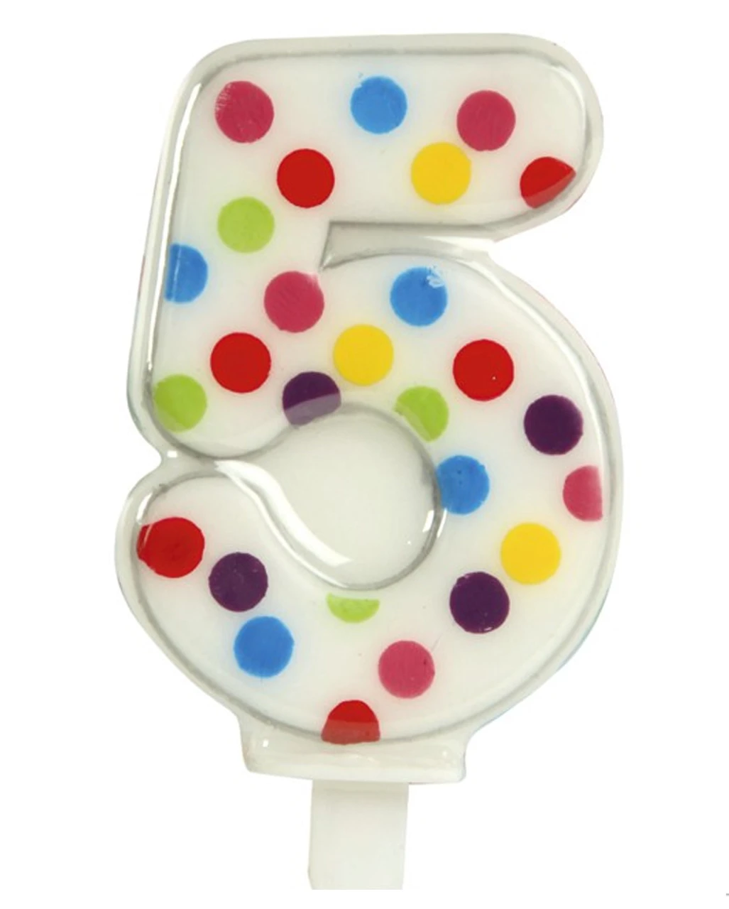Bestelle jetzt die Konfetti Zahlenkerze Nr. 5 mit bunten Punkten und der Zahl Fünf und benutze diese für deine Geburtstagsüberraschung. Mit der Zahlenkerze lassen sich alleine oder in Kombination mit anderen Zahlenkerzen, die gewünschte Jahreszahl des Geburtstagskindes zusammensetzen. Eine Geburtstagstorte, mit den lustigen bunten Zahlenkerzen dekoriert, ist eine stimmungsvolle Partyüberraschung für jedes Jubiläum.