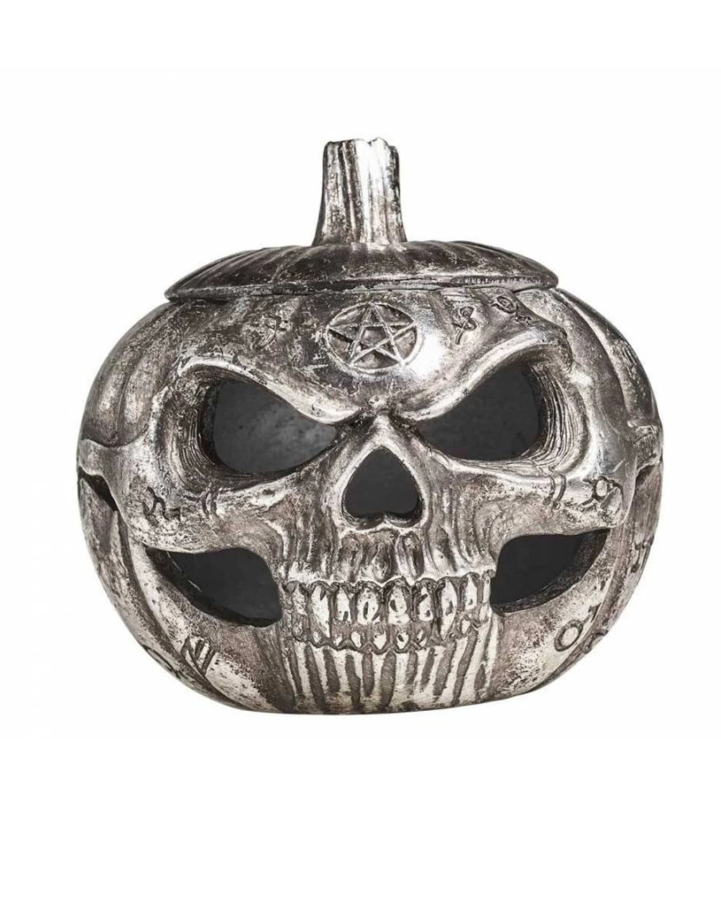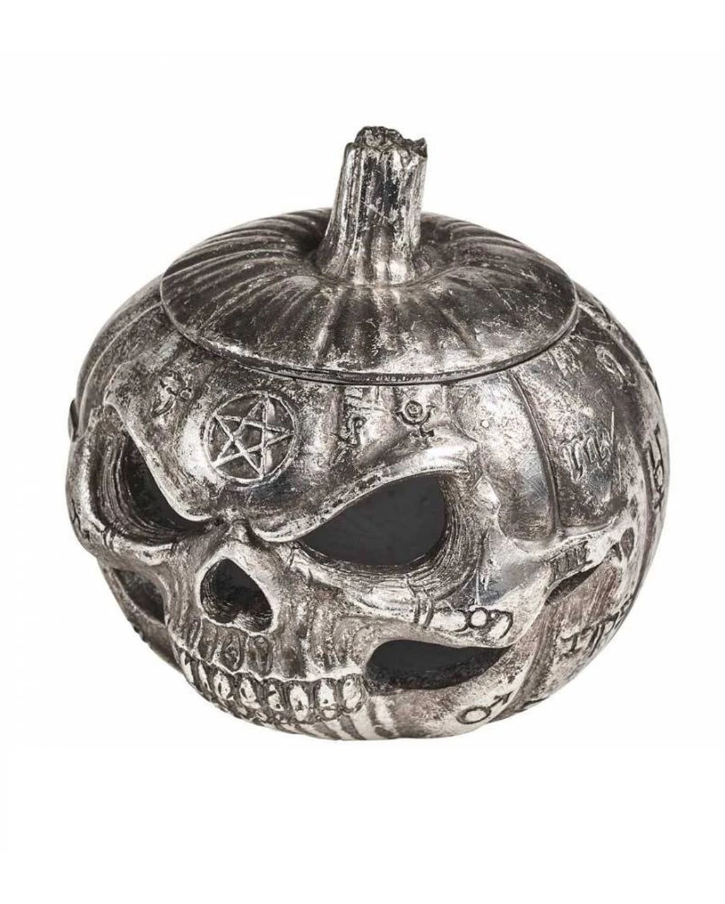 Diese einzigartige Kürbis Totenkopf Schale ist aus hochwertigem Polyresin gefertigt und von Hand bemalt. Nicht nur die schrecklichen Details wie die Zähne, das grimmige Grinsen oder das Pentagramm wirken beeindruckend. Der silbrige Antik-Effekt macht den Totenschädel zum Hingucker. Und natürlich ist das subtile Gothic Design nicht nur zu Halloween eine fantastische Ergänzung für jeden Raum. Warum also nicht ein LED-Licht hinzufügen, um die Kürbis Totenkopf Schale in ein mystisches Nachtlicht zu verwandeln!