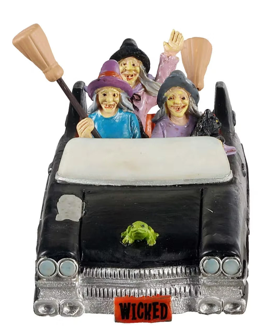 Der Mädelsabend an Halloween und zur Walpurgisnacht ist fest im Kalender vorgesehen und zum Hexentag. Unsere Spooky Town Figur zeigt ein schwarzes Cabrio im Halloween-Design mit schwarzen Katzenfelgen. Im Inneren des Autos sitzen drei Hexen, die ihre Spritztour durch die Stadt genießen, während sie ihre treuen schwarzen Katzen und Besen festhalten. Die Hexen sind mit ihren üblichen Hexenhüten und Umhängen gekleidet. Eine grüne Kröte sitzt auf der Motorhaube des Wagens und macht die Fahrt mit. Würdest du einen Ritt auf dem Besen bevorzugen?