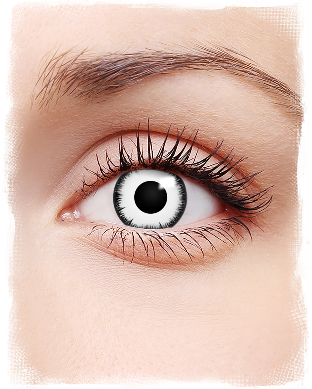 Schaurige Gestalten ziehen zu Halloween durch die Strassen und Gassen. Um besonders ungewöhnlich auszusehen sind Kontaktlinsen mit aussergewöhnlichen Farben und Mustern ein beliebtes Zubehör. Die Special Effekt Kontaktlinsen Lunatic White verleihen dir den Blick eines Vampirs, Werwolfs, aber auch eines Wahnsinnigen der aus der Irrenanstalt entflohen ist. Die genialen Lunatic Kontaktlinsen haben eine weiße Iris die von einem schwarzen, gefiederten Rand umgeben sind.
