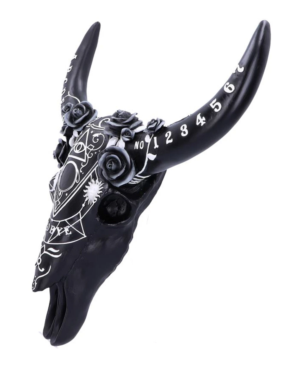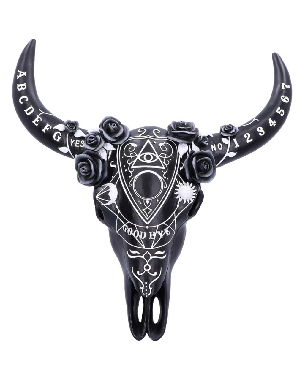 Morbide, unheimliche Deko als alternatives Wohnaccessoire für Liebhaber des Makabren und Ungewöhnlichen. Kleine schwarze Rosen befinden sich auf der Rückseite eines Büffelschädels, während ein Teil des Alphabets in Weiß auf seinem linken Horn und die Zahlen 1 bis 7 auf dem rechten zu sehen sind. In der Mitte des Schädels prangt der Umriss einer Planchette mit einem dreieckigen Augenschmuck. Über dem Nasenrücken steht das Wort „Goodbye“ geschrieben, während Mond und Sonne den ständigen Kreislauf des Lebens darstellen.