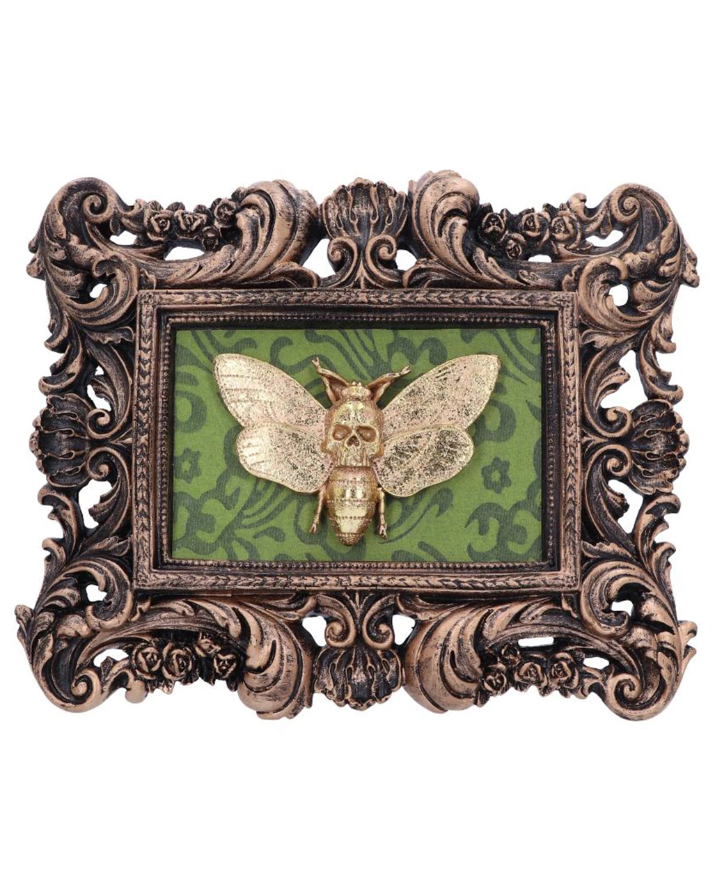 Das außergewöhnliche, rechteckige Wandbild ist aus feinstem Polyresin gegossen und in Bronze und Gold ausgeführt. Im Inneren des Barockrahmens sitzt eine goldene Atropos Totenkopf Motte, auf ihrer Rückseite befindet sich ein goldener Schädel, die Flügel der Motte scheinen seitlich aus dem Schädel hervorzustehen. Die Motte ruht auf einem kunstvollen lindgrünen Hintergrund. Das rechteckige Totenkopfschwärmer-Motte Wandbild ist ein einzigartiges Gothic Wohnaccessoire für jeden, der sich für makabere Kuriositäten und gotische Themen interessiert.