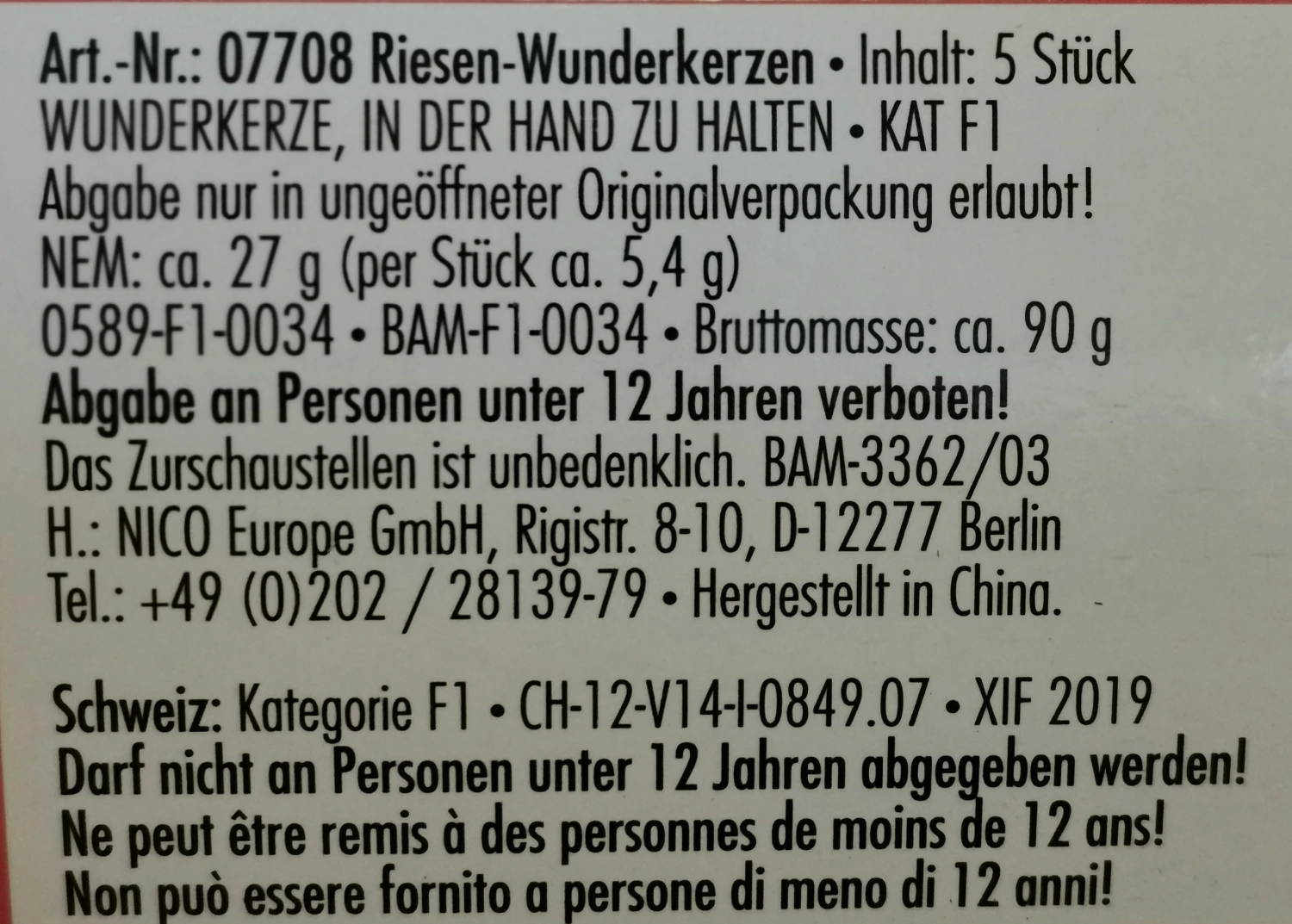 Warnhinweise: Abgabe an Personen unter 12 Jahren verboten! Abgabe/Aufbewahrung nur in ungeöffneter Originalpackung erlaubt. Von Hitze/Funken/offener Flamme/heißen Oberflächen fernhalten. Einzeln über nicht brennbarer Oberfläche verwenden. Eine Wunderkerze nach der anderen am äußersten Ende anzünden. Sicherheitsabstand: 1 Meter, Wundekeze von allen Körperteilen und brennbaren Materialien fernhalten. Enthält Bariumnitrat. Beim Einatmen vom Rauch und beim Verschlucken gesundheitsschädlich. Abgebrannte Wunderkerze z.B. in einem Wassereimer ablöschen!