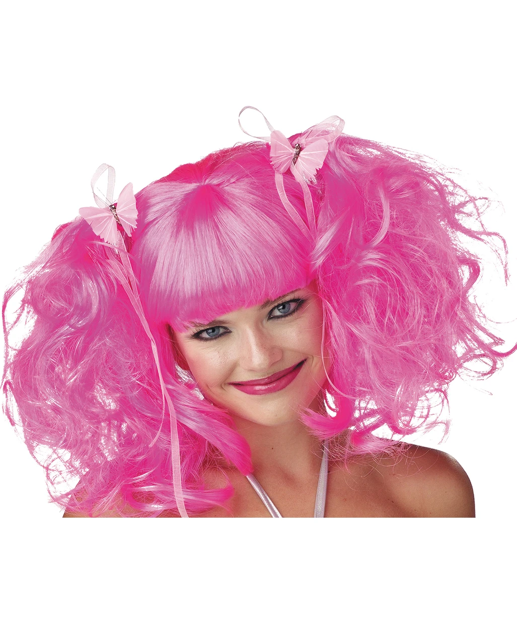Die Pinke Fantasy Cosplay Perücke mit Zöpfen besitzt zwei rosa Schmetterlinge als Verzierung. Mit der Faschingsperücke bist du bestens für die nächste Faschings, Halloween und Mottoparty im Sailor Moon Style frisiert. Optional passen dazu die Elfenflügel rosa aus unserem Online Angebot.