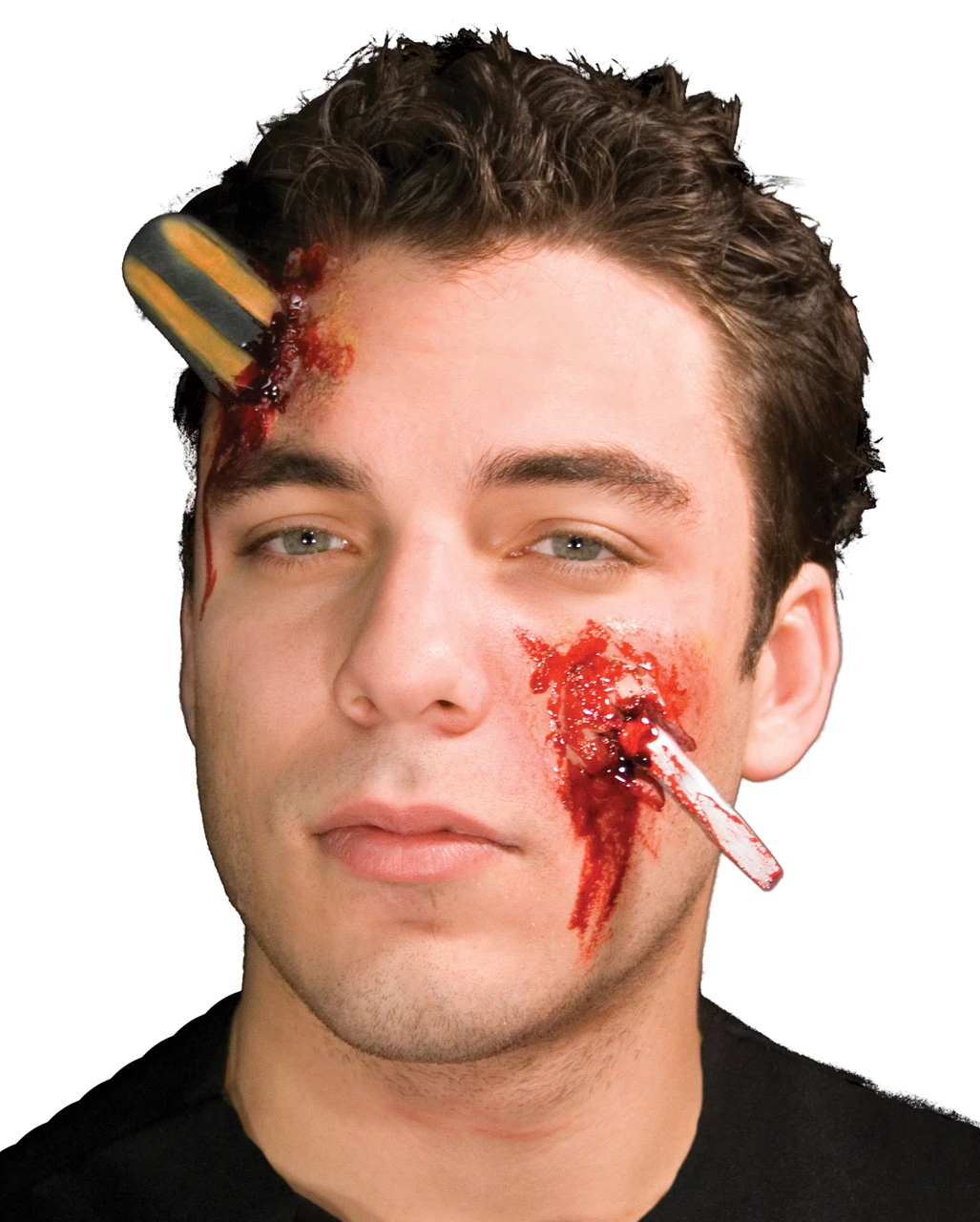 Geniale Schraubenzieher Wunde aus Latex für ein gelungenes Halloween Make Up. Die nach dem Schminken realistisch aussehende Schraubenzieher Wunde ist vielseitig und öfter einsetzbar. Mit der Spezial Make Up Latexapplikation können neben dem Gesichtsbereich auch andere Körperstellen wie Oberarme, Beine, Brust und Rücken mit einem im Körper steckenden Schraubenzieher verziert werden. Extrem coole Wunde für dein Auftritt als gescheiterter Heimwerker oder Bauarbeiter.