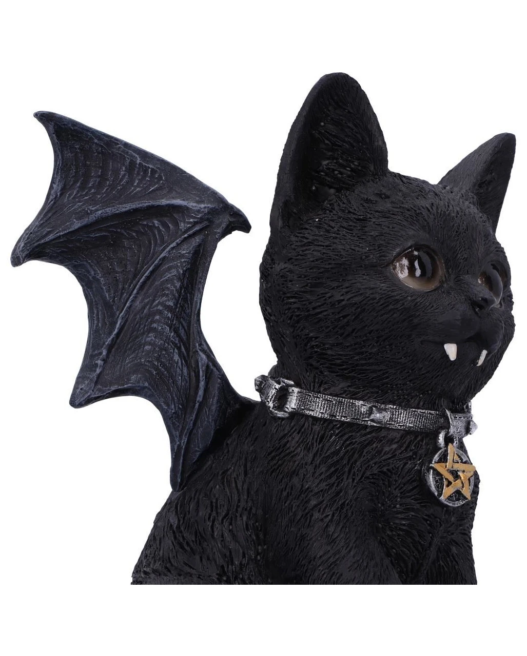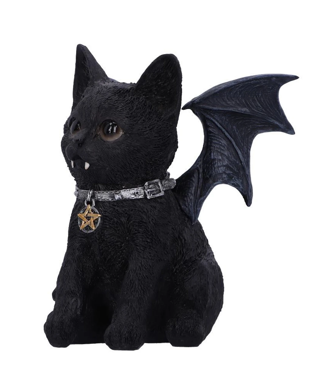 Verschenke die schwarze Katze Vampuss an einen Gothic Fan und Liebhaber okkulter Deko Figuren. Das Herz des Beschenkten wird vor Freude schneller schlagen. Was für ein Anblick! Die kleine Katze mit Fledermausflügeln und Vampirzähnen ist so ziemlich das niedlichste, was man zu Halloween und Walpurgisnacht dekorieren kann. Vampuss sitzt da und starrt in den Himmel und sehnt sich danach, mit seinen kleinen Fledermausflügeln zu fliegen. Als mystisches Kätzchen trägt Vampuss ein kleines Pentagramm an seinem Kragen und hat schwarze, kleine Knopfaugen.