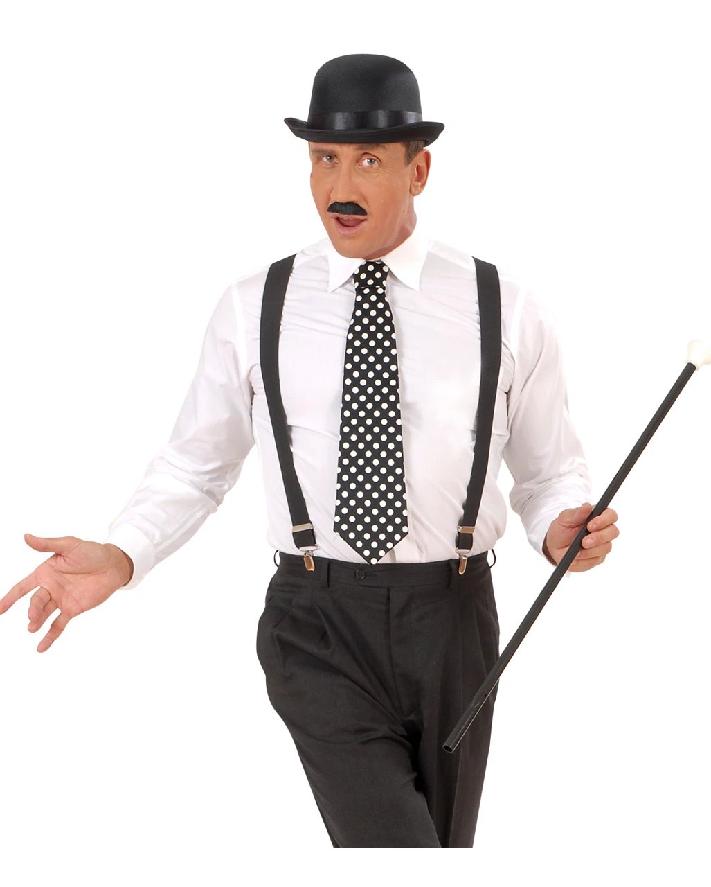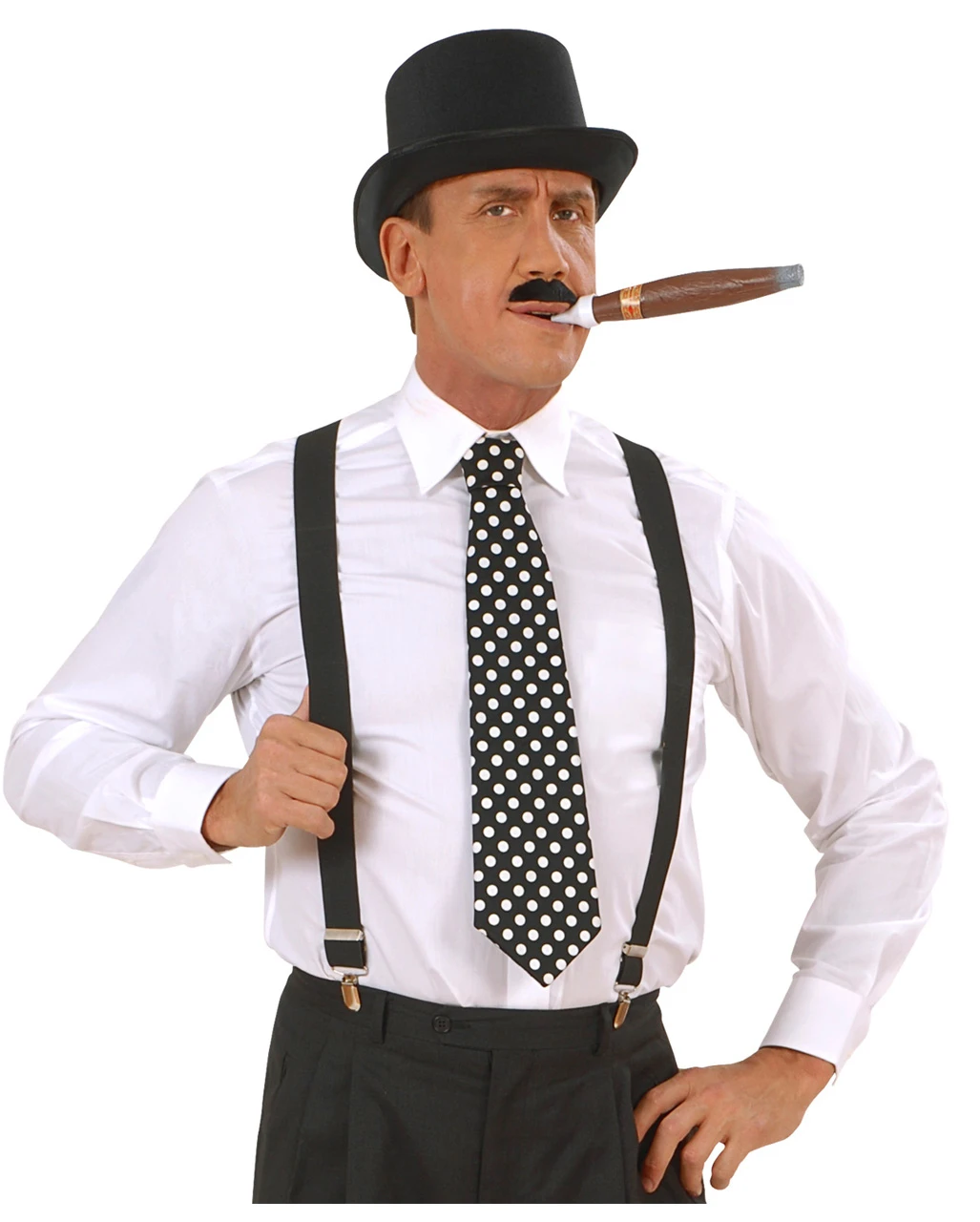 Unsere Krawatte erspart dir dabei das lästige Binden. Mit einem Stretch-Gummiband mit Klettverschluss wird die Krawatte einfach unter deinem Hemdkragen angebracht. Der feine Stoff der schwarzen Krawatte ist mit vielen weißen Punkten versehen. Der Schlipsknoten ist in sich vernäht, sodass er sich nicht von selbst öffnen kann. Kombiniert mit Schwarze Hosenträger und einem Schwarzer Mafia Hut, zu einem weißen Hemd getragen, besitzt du ein elegantes Mafioso-Kostüm.
