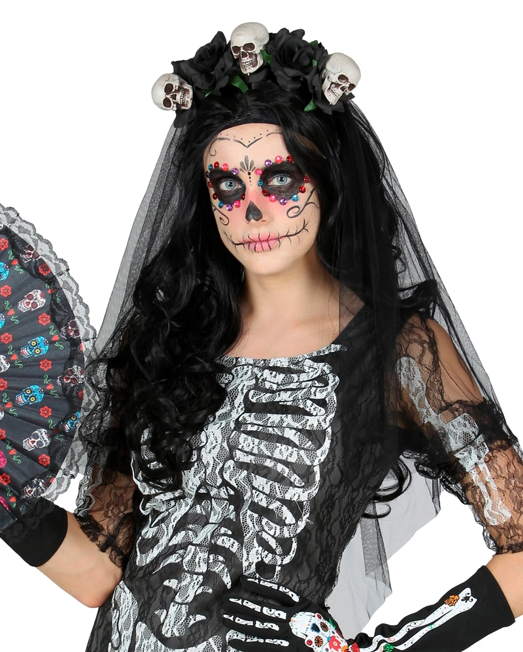 Lieferumfang: 1 x Schwarzer Brautschleier mit Totenköpfen