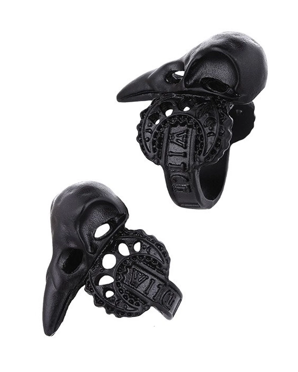 Der schwarze, dämonisch wirkende Fingerring zeigt einen 3D Krähenschädel, der mit Halbmonden und Mondphasen durchbrochen ist und zusätzlich das Wort WITCH als Inschrift platziert hat. Die gleichen, mystischen Symbole sind auf beiden Seiten des Rings angebracht.