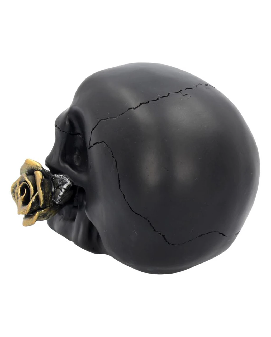 Gegossen aus feinstem Polyresin und anschließend liebevoll handbemalt, ist dieser schwarze Totenkopf mit goldener Rose die perfekte Ergänzung für dein alternatives Zuhause