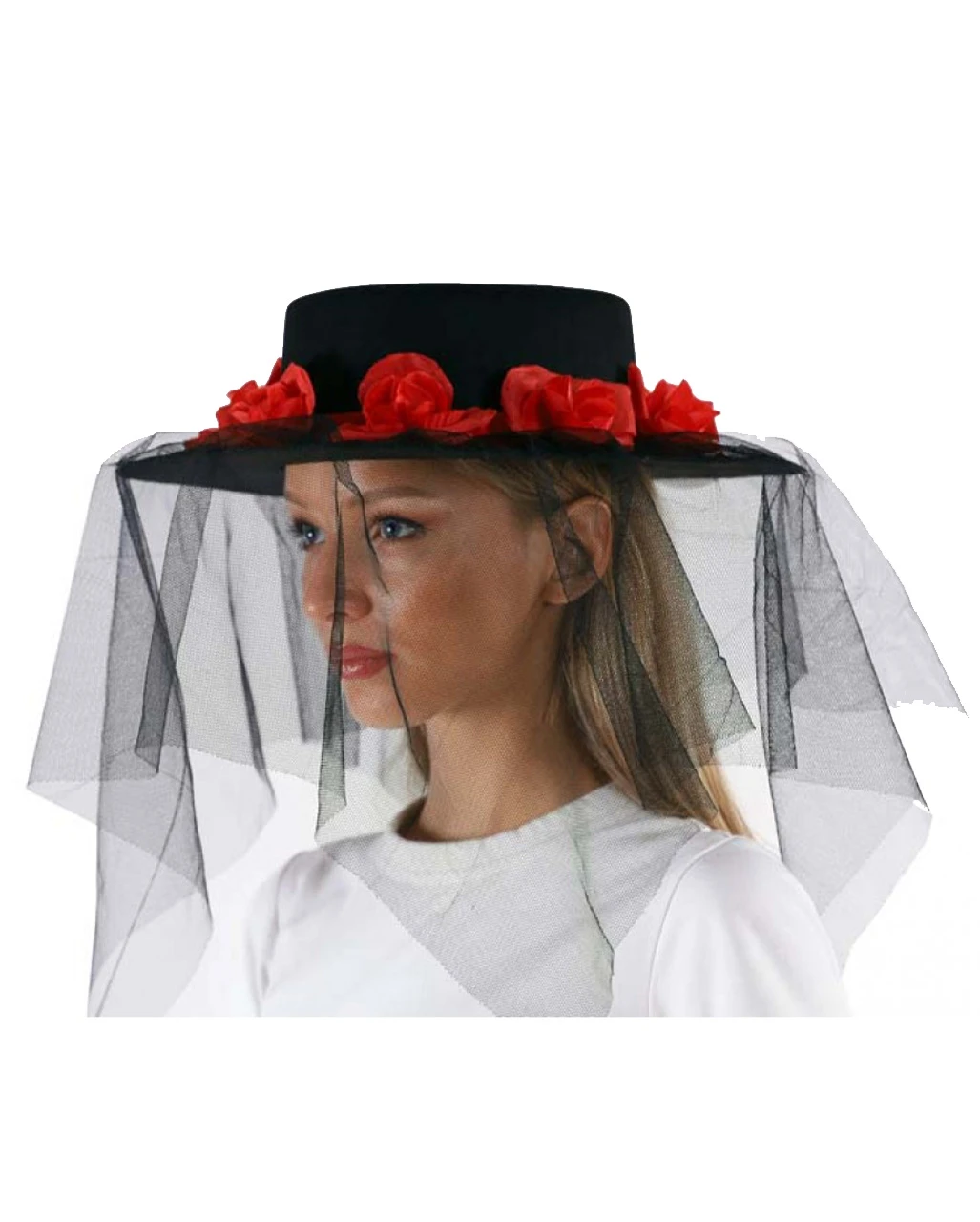 Der schwarze Witwen Hut mit Rosen & Schleier ist ein toller Kostümhut für Fasching und Halloween. Unser Kostümhut hat eine klassische Form mit breiter Krempe. Der Hut ist schwarz, der Schleier, der über die Krempe hängt, natürlich auch. Nur die roten Rosen geben einen feinen Farbakzent bei diesem stilvollen schwarze Witwe Halloween Kostümzubehör. Passende Accessoire wie den Gummi Dolch Dekowaffe Schwarz findet ihr hier im Shop.