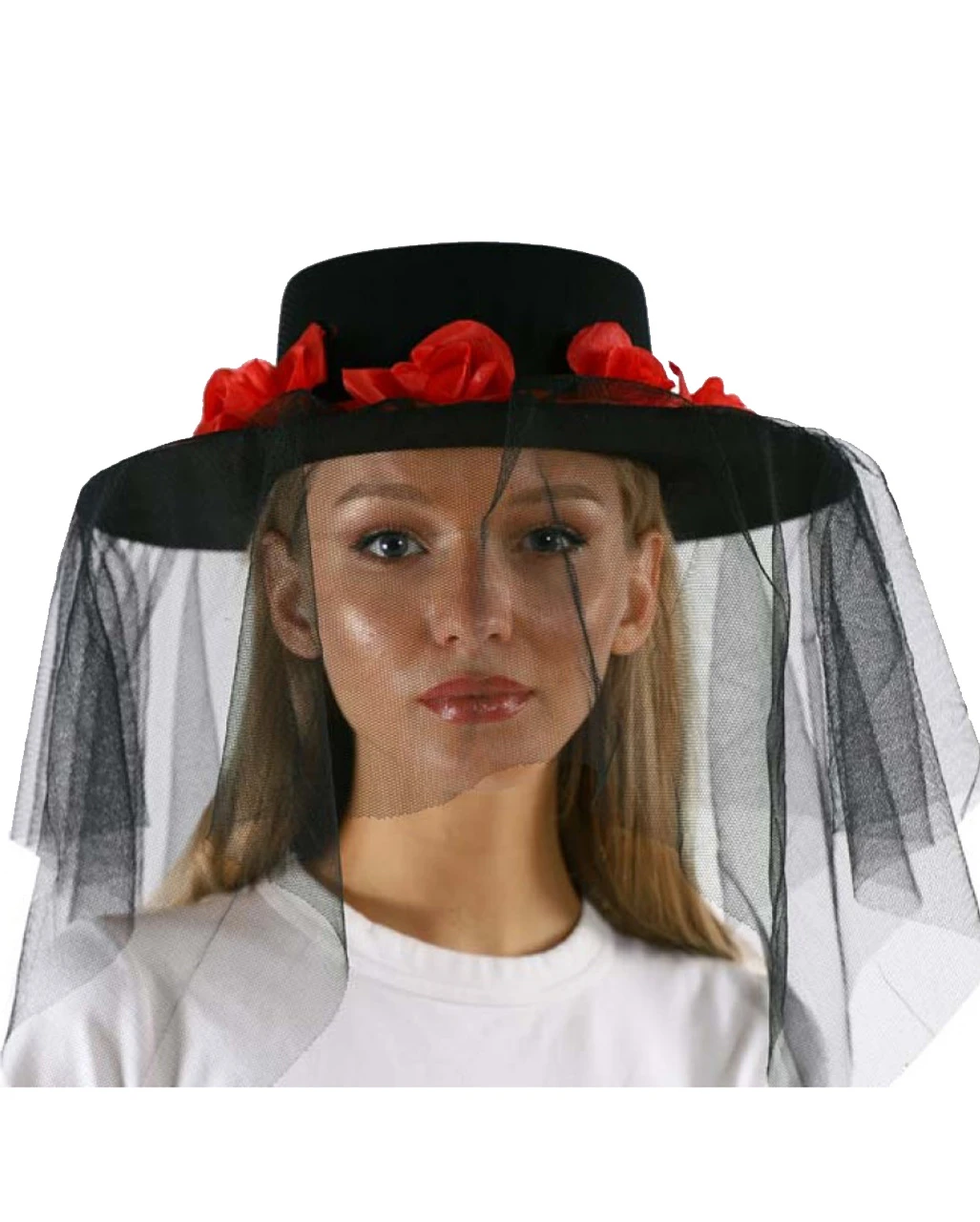 Schwarzer Witwen Hut mit Rosen und Schleier