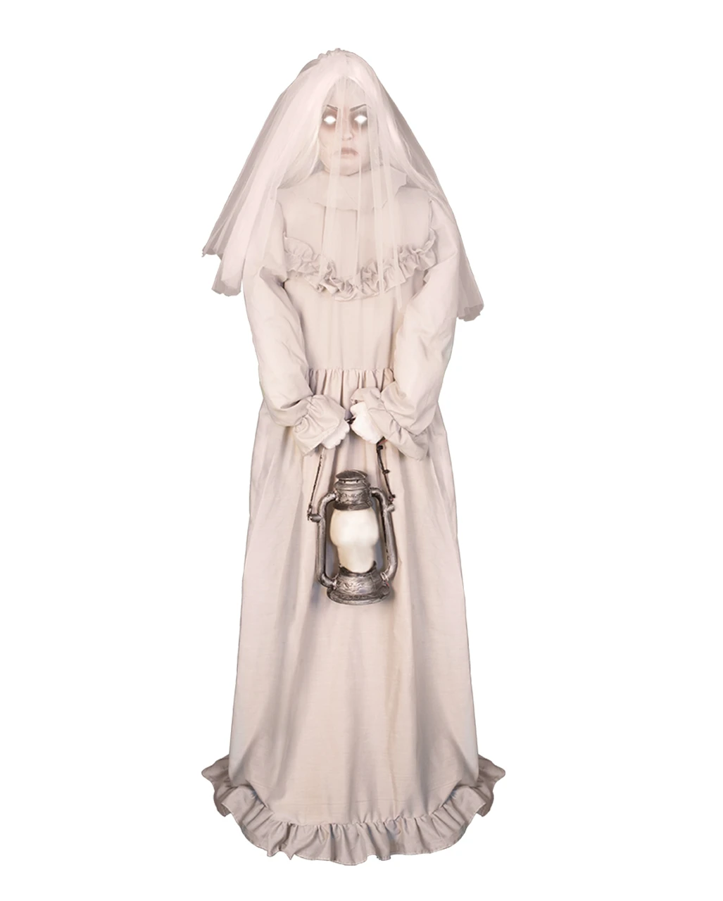 Die Gespensterlady mit einer Größe von über 1,5 m sorgt mit schaurigem Sound, gespenstischen Bewegungen und düsterer Beleuchtung sofort für wahres Geisterbahn-Feeling! Sichere dir mit unserem schwebenden Geisterfrau Halloween Animatronic eine Halloween Dekoration der Extraklasse, die sich sowohl für professionelle Veranstalter, als auch private Halloween- und Horrorpartys hervorragend eignet!