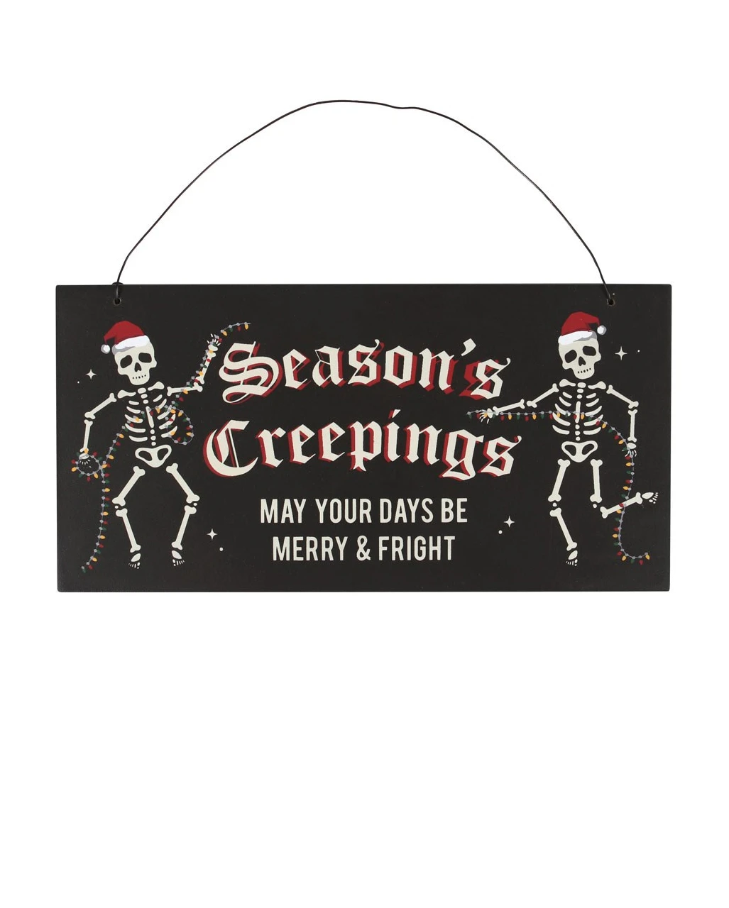 Das außergewöhnliche Season’s Creepings Hängeschild ist aus MDF (Holz) und ist ca. 21 x16 x 1 cm groß. Neben den fröhlichen Gerippen und den funkelnden Lichtern zeigt das Gothic Deko Schild den Text „Season’s Creepings. May your days be merry & fright“. Damit hast du außerdem ein extravagantes Weihnachtsgeschenk für Halloween und Gothic Liebhaber.