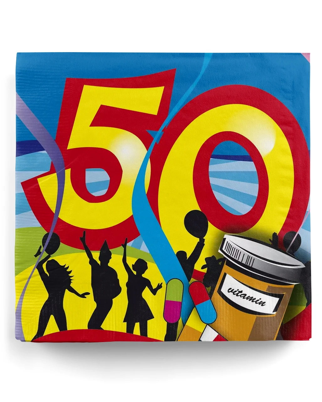 Der fünfzigste ist ein besonderer Geburtstag, den man ordentlich feiern muss! Mit den Servietten Swirls 50. Geburtstag kannst du deinen Partyraum wunderbar dekorieren. Das Partymotiv mit tanzenden Menschen & Vitaminen für den Kater am nächsten Tag sorgt für die passende Atmosphäre.