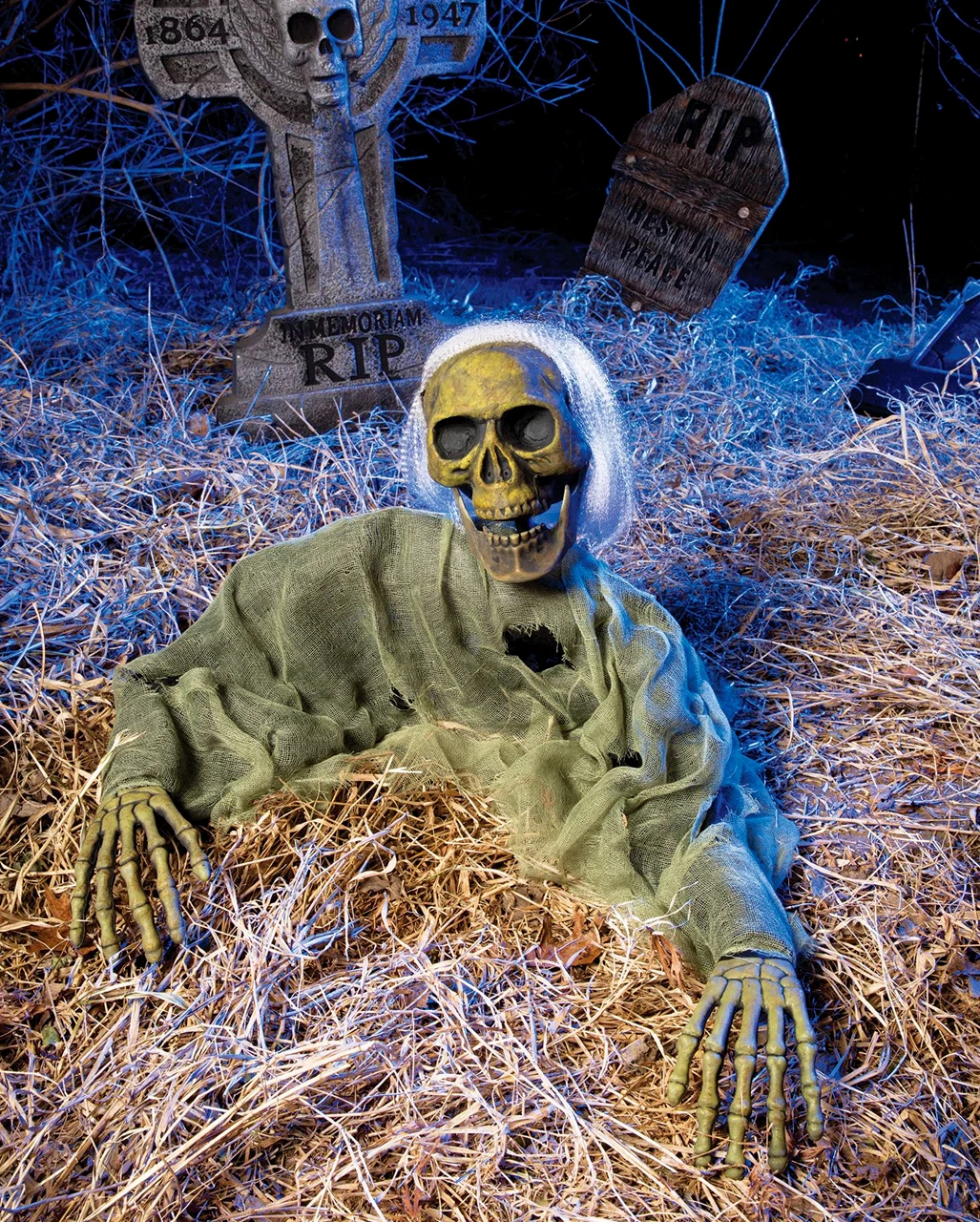 Der Skelett Gravebreaker Zombie macht alle deine Eskapaden treu ergeben mit. Stecke die Skelett Deko Figur dazu in die Erde. Der befestigte Bodenanker ist 17 cm gesamt. Davon können ca. 12,5 cm in den Boden gesteckt werden. Die Halloween Deko-Figur zeigt ein verrottetes Skelett, das sich scheinbar zur Hälfte aus seinem Grab befreit hat. Die letzten weißen Haare flattern im Wind, die dunklen Augenhöhlen des grünlichen Zombie Skeletts schauen dich leer an. Ergänze deine Halloween Friedhofs Deko mit einem Halloween Grabstein R.I.P. und etwas Deko Moos 80g.