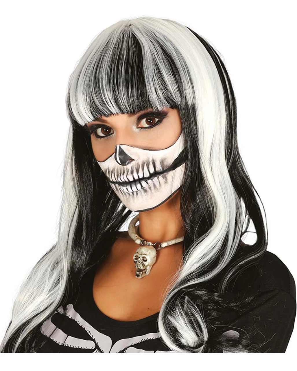 Mit der schönen Skelett Perücke schwarz-weiß hast du die perfekte Halloween Perücke gefunden. Die schwarz-weiße Damenperücke passt sowohl zu deinem Kostüm als Skelett-Frau, als auch zum Hexen oder Vampir Kostüm. Als schwarz-weiße Halloween Perücke ist sie ein universell einsetzbares Kostümzubehör für Kostümpartys.
