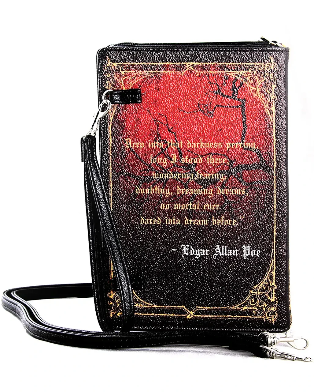 Unsere The Raven Vintage Buch Clutch lässt Horror und Gothic Fans aufatmen. Endlich eine Gothic Schultertasche, die nicht langweilig aussieht. Frei nach dem Motto „Lebe lieber ungewöhnlich“ wird aus einem Buch eine Tasche und eine legendäre Horror Story von Altmeister Edgar Allen Poe wird zu deinem treuen Begleiter in der Nacht. Die Gothic Handtasche in Buch Form wird zum Blickfang. Damit wirst du die Bewunderung und den Respekt aller anderen Geschöpfe der Nacht einstreichen. Diese einzigartige Kombination aus großer Gothic Fashion mit Horror und Literaturgeschichte ist schließlich einzigartig.