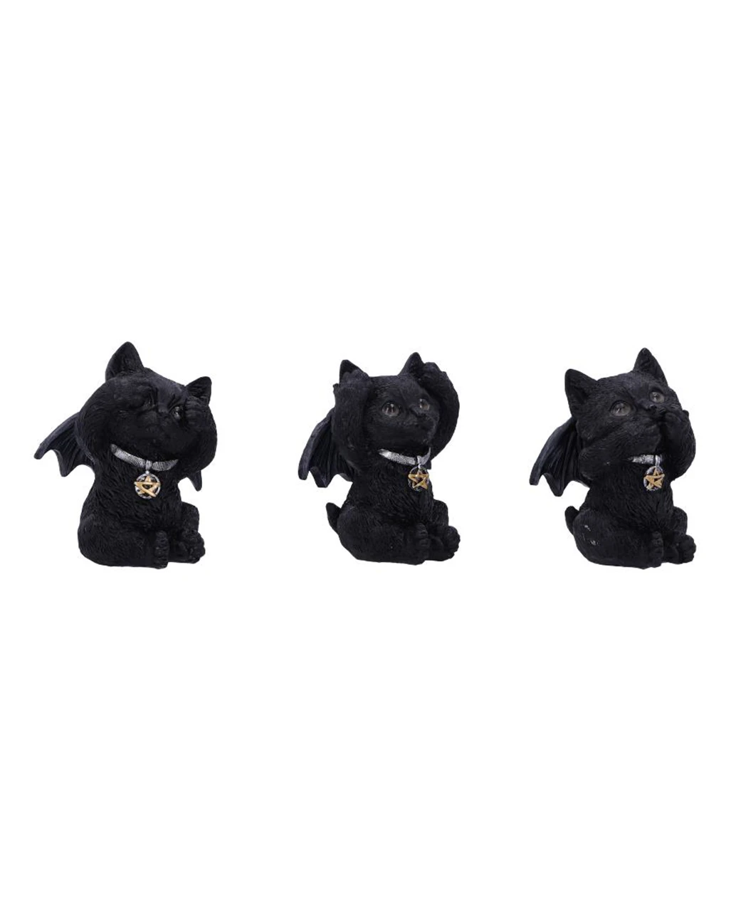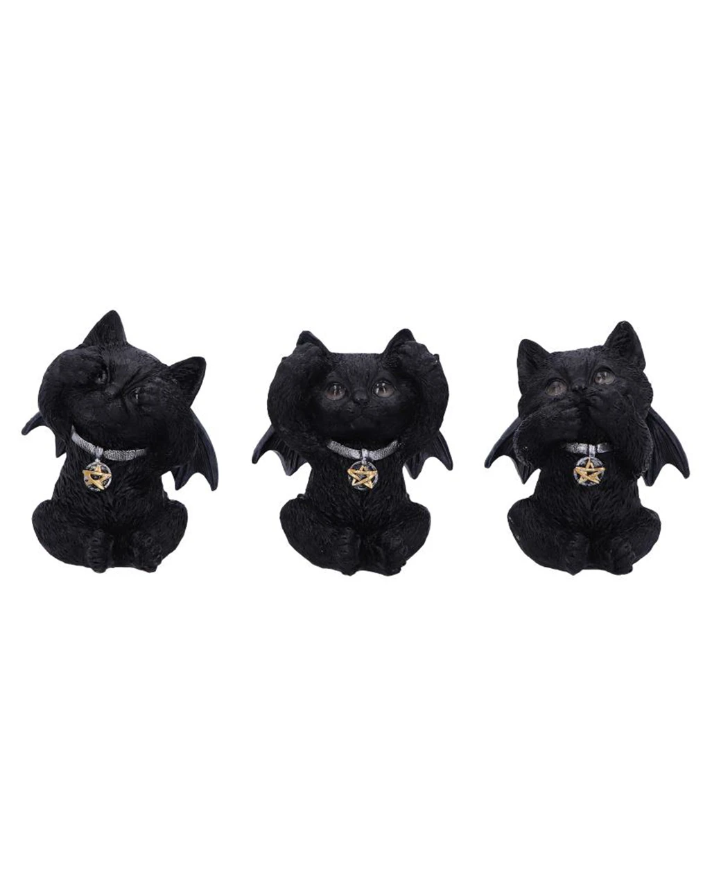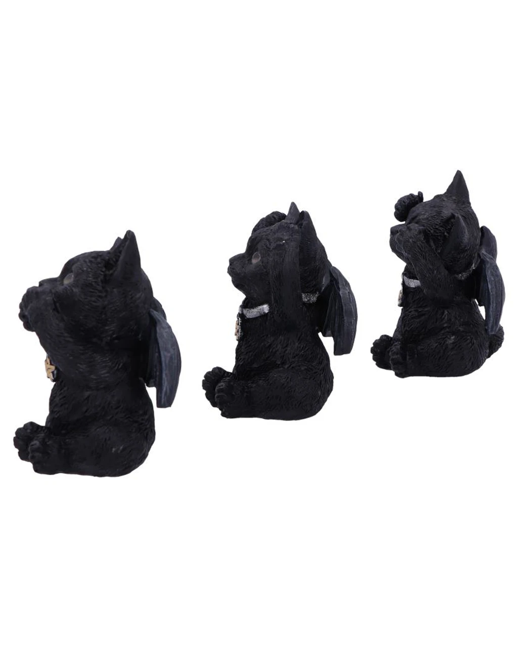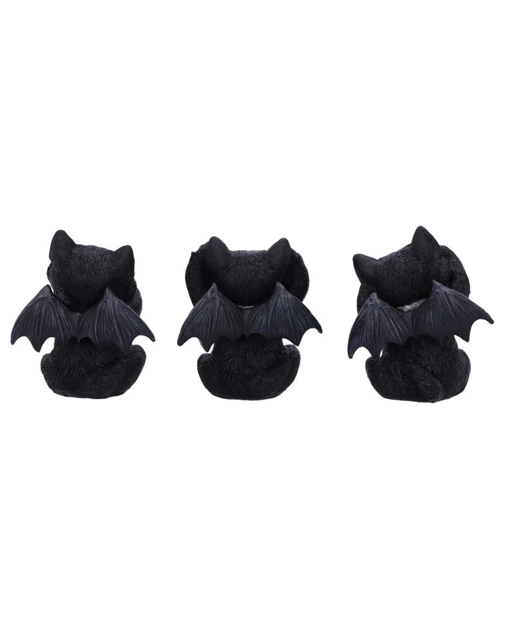 Unsere Drei Weise Schwarze Vampir Kätzchen sind als zusammengehöriges 3er-Set erhältlich. Zusammen lassen die drei weisen Katzen fernöstliche Weisheiten und westliche Halloween Dekorationen zu einem genialen Wohnaccessoire verschmelzen! Die Katzen sind aus hochwertigem Kunststein gestaltet und handbemalt. Sie sind schwarz, haben niedliche Fledermausflügel und kleine Gesichter mit Vampirzähnchen. Sichere dir mit den drei weisen Katzen eine niedliche Deko oder ein perfektes Geschenk für Katzen Fans!