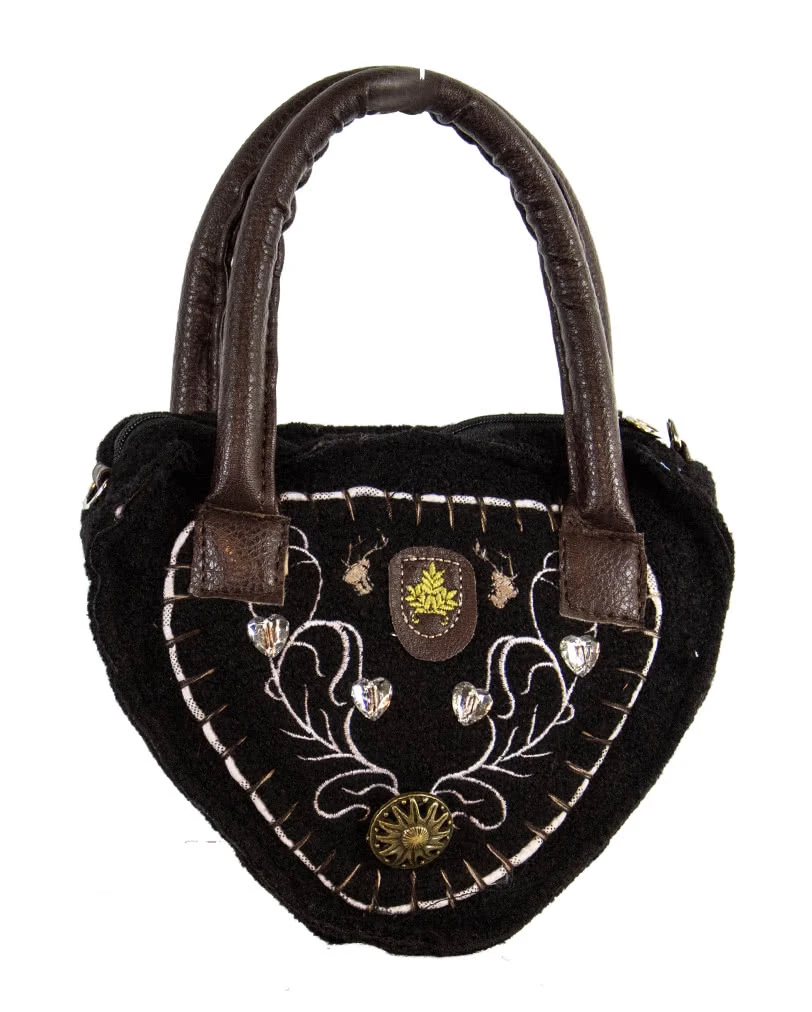 Die schwarze Trachtentasche aus festem Stoff besticht durch ihren Tiroler Look mit aufgestickten Hirschköpfen, silbernen Ranken, aufgenähtem Trachtenknopf im Enzianstil und vier silbernen Schmuckherzen. Innen hat die Tasche ein kleines Fach, das mit einem Reißverschluss verschlossen werden kann. Der äußere Reißverschluss hat einen Herzanhänger am Verschluss. Die Tasche wird mit einem braunen Umhängeband in Lederoptik geliefert, kann aber auch an den beiden Tragehenkeln in Lederoptik getragen werden. Die Tasche passt zu dem Trachten Liesl Kostüm.