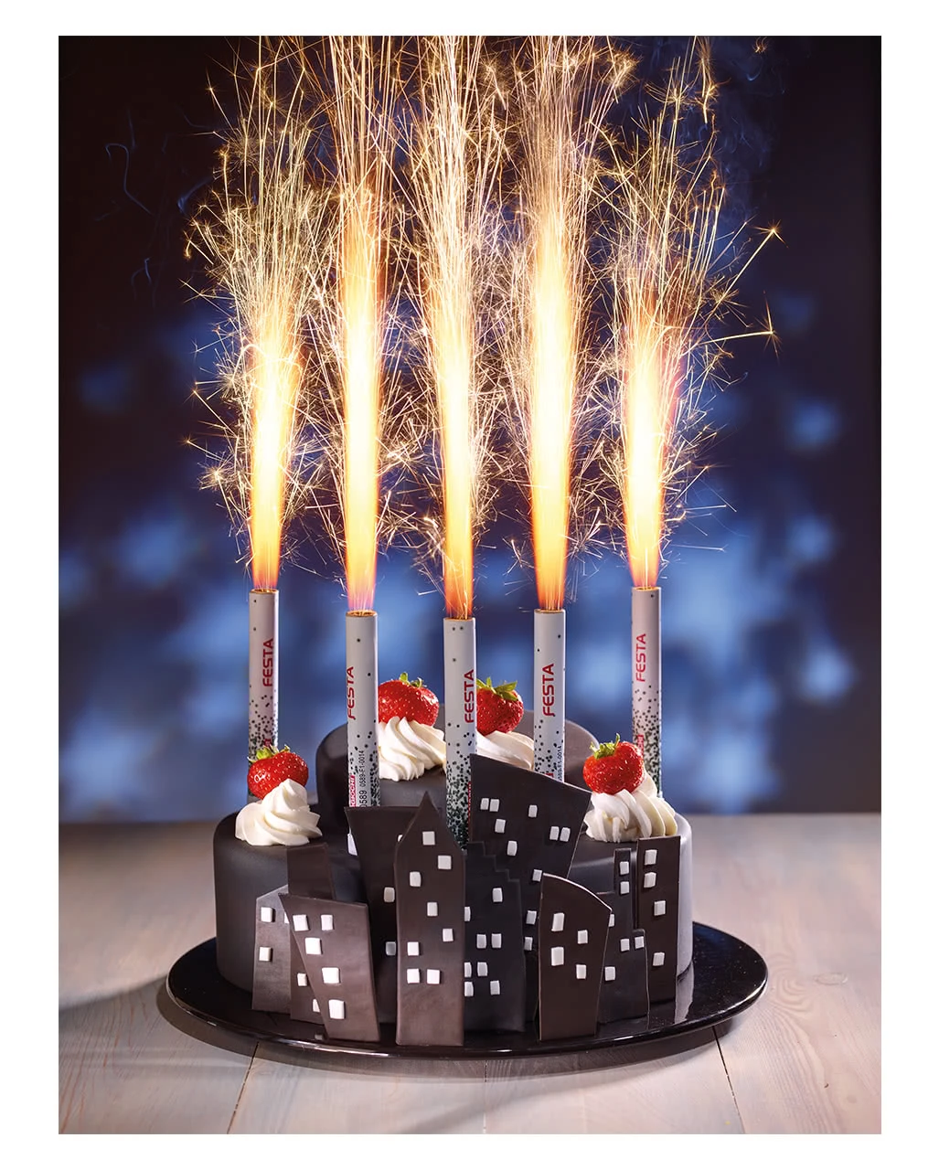 Die 3 silbernen Torten-Fontänen werden mit der Plastikspitze, in nicht brennbare Oberflächen wie Kuchen, Torten, Sand etc. gesteckt und mittels des mitgelieferten Zündstäbchen angezündet. Daraufhin sprühen silberne Funken in die Höhe und verbreiten echtes Silvester-Feeling in deiner Wohnung. Das Geburstagsfeuerwerk eignet sich sowohl für den Innen- als auch den Außenbereich. Weitere Kuchen & Buffet Dekorationen wie die Eisfontäne Happy Birthday und die Zaubersterne 4er Packung kannst du bei uns bestellen!
