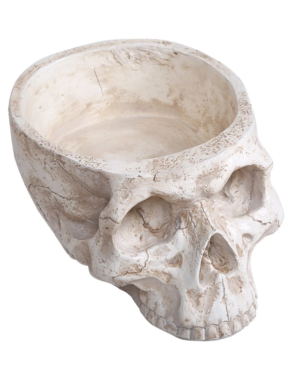Auch als Halloween Tisch Deko ist die Totenkopf Schale 28cm bestens geeignet. Die Totenkopf Pflanzenschale hat die Farbe und die Form eines echten menschlichen Totenschädels. Man erkennt die Augenhöhlen, die Nasenlöcher, den Oberkiefer und alles, was unseren humanoiden Schädel ausmacht. Natürlich ist sie aber nicht aus Knochen, sondern wurde aus hochwertigem Polyresin gegossen. Weitere Deko für Totenkopf Fans findet ihr hier Shop!